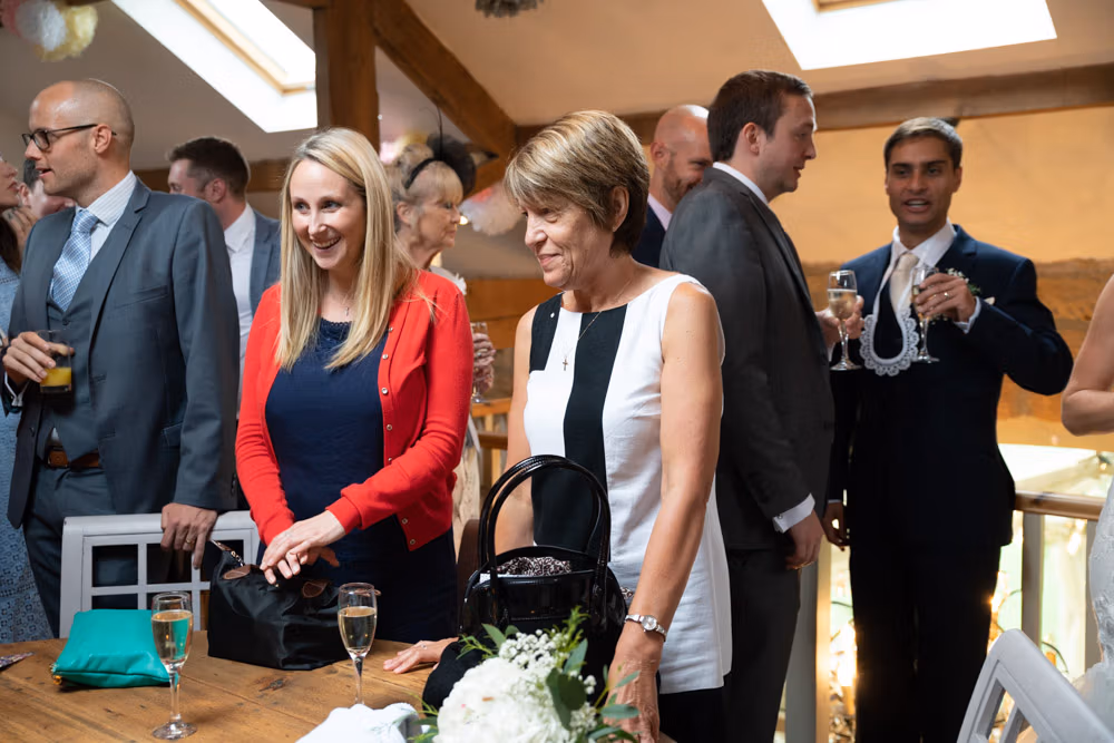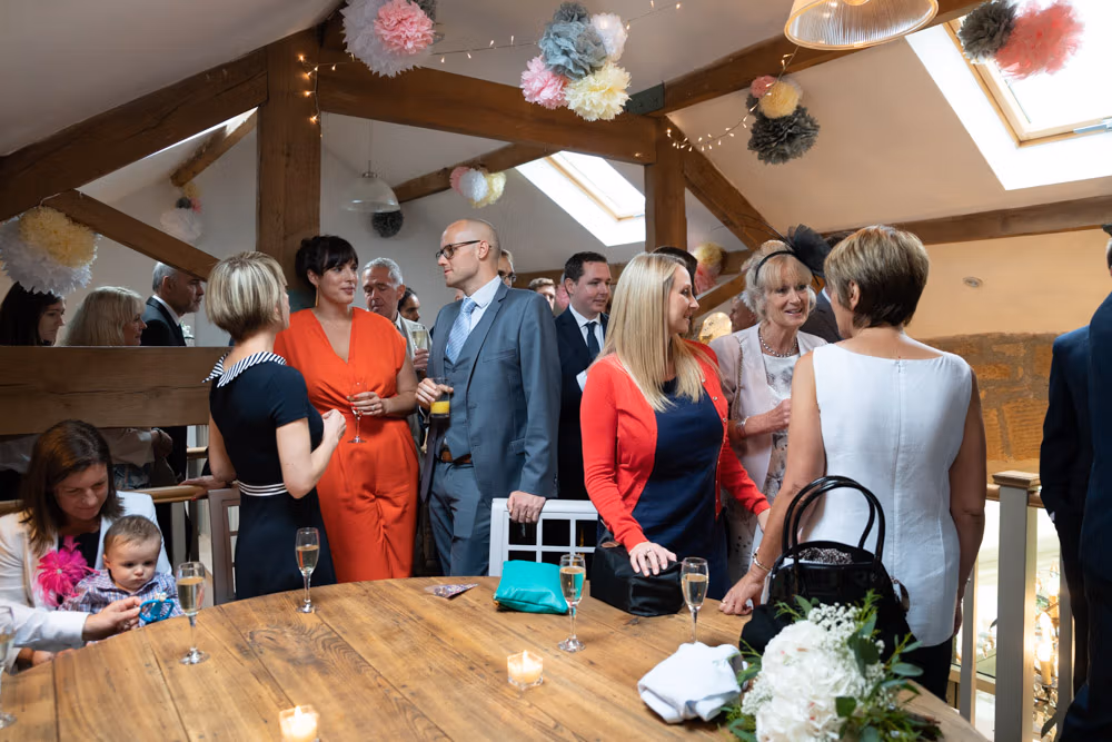 After the ceremony, we moved upstairs into the barn where guests gathered for relaxed hellos and natural portraits, with the marquee set below ready for the wedding breakfast.