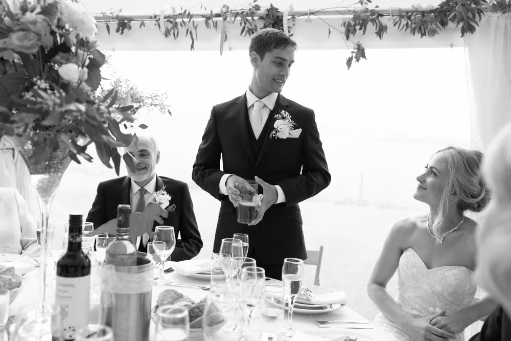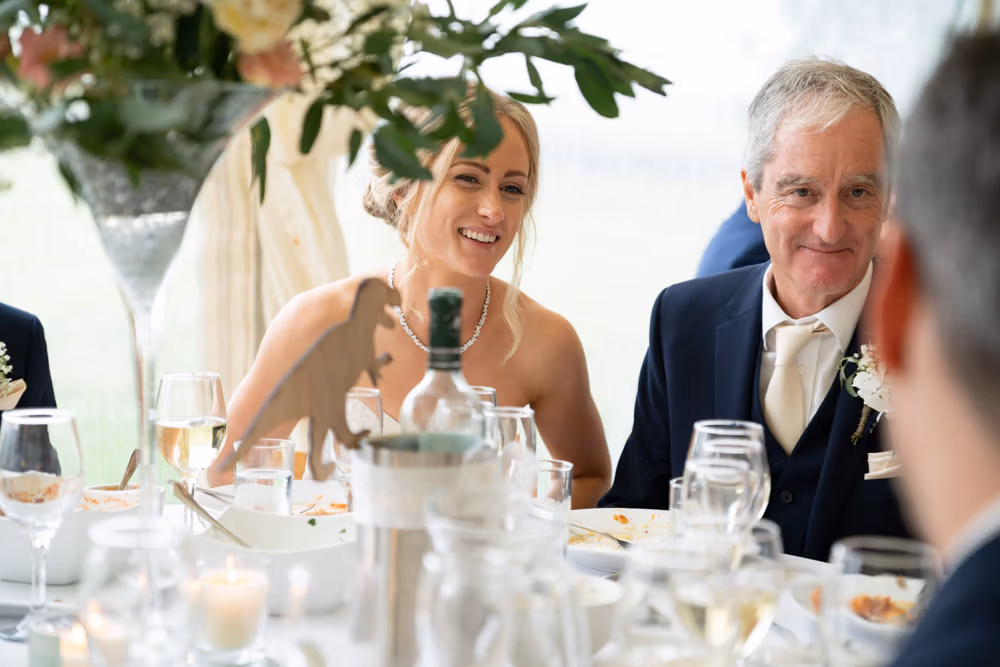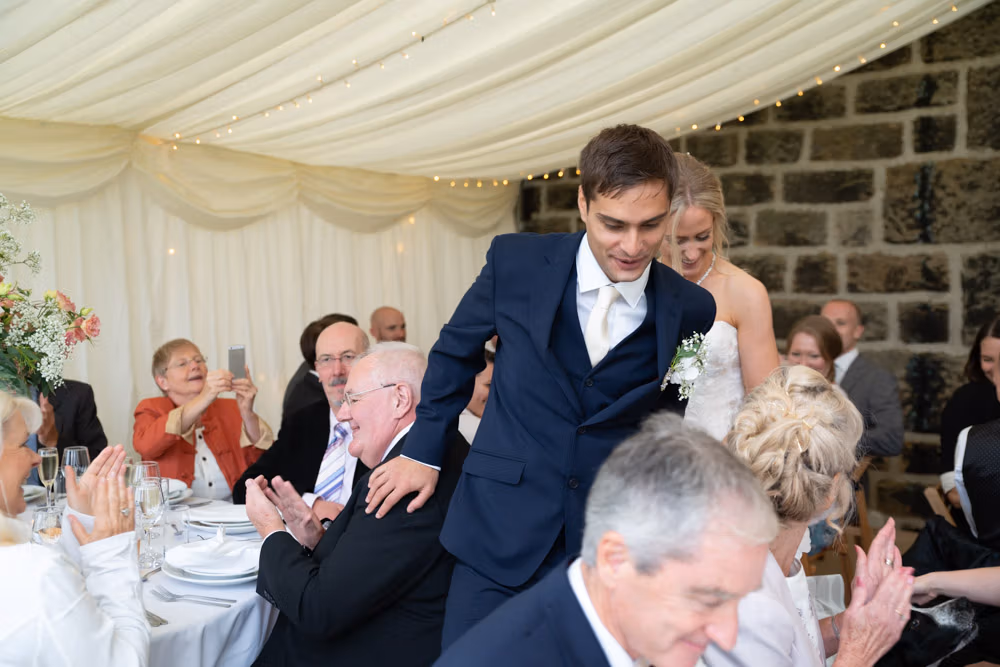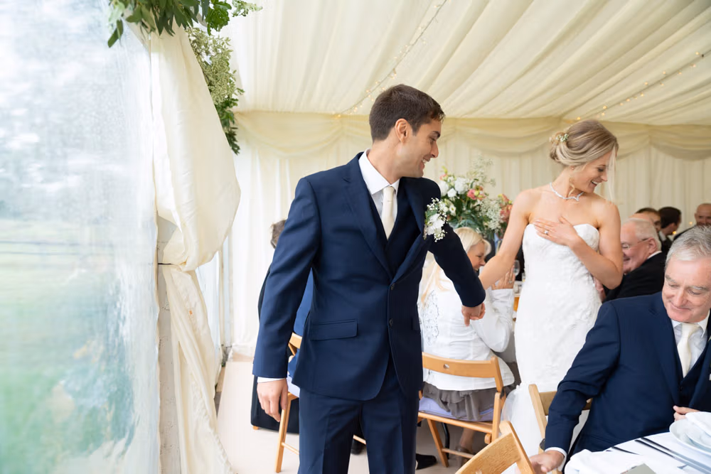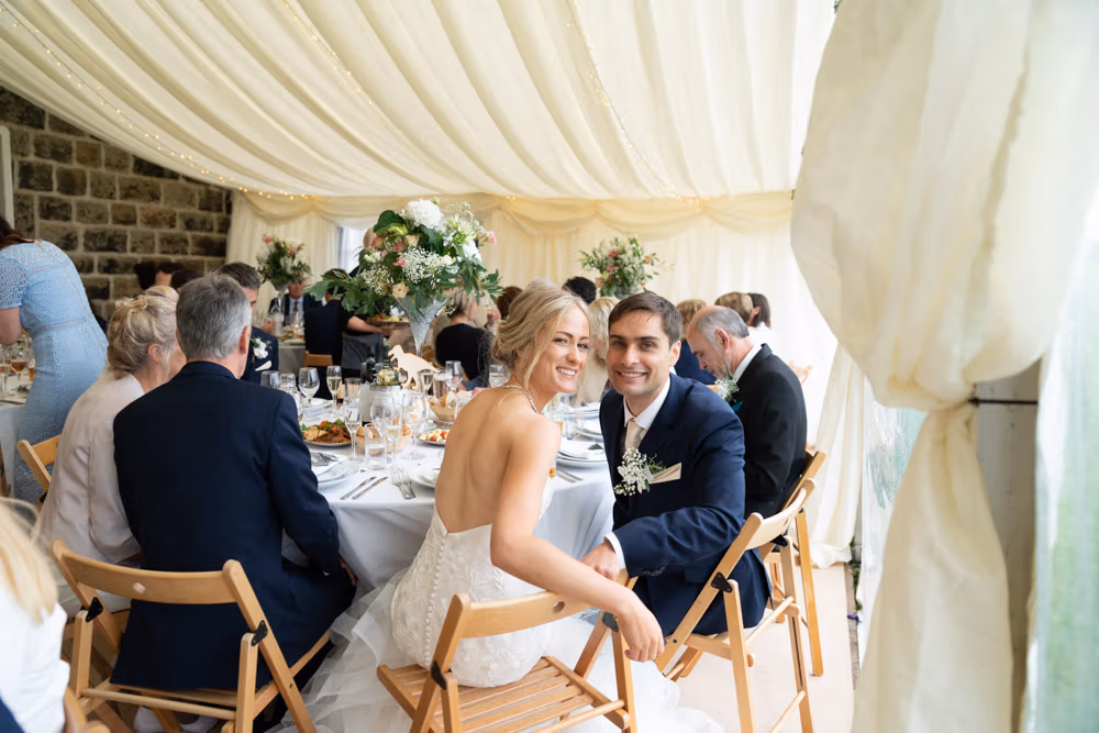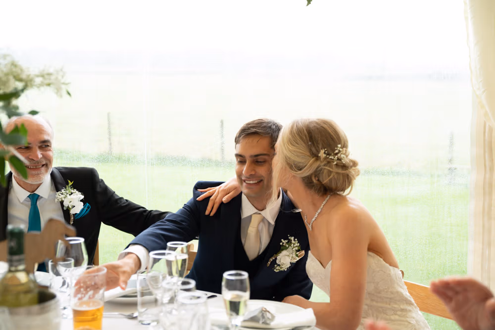 With the marquee set below the barn, the wedding breakfast at The Chilli Barn felt warm, relaxed, and full of atmosphere. Glasses clinked, stories were shared, and the room filled with laughter as friends and family gathered together.