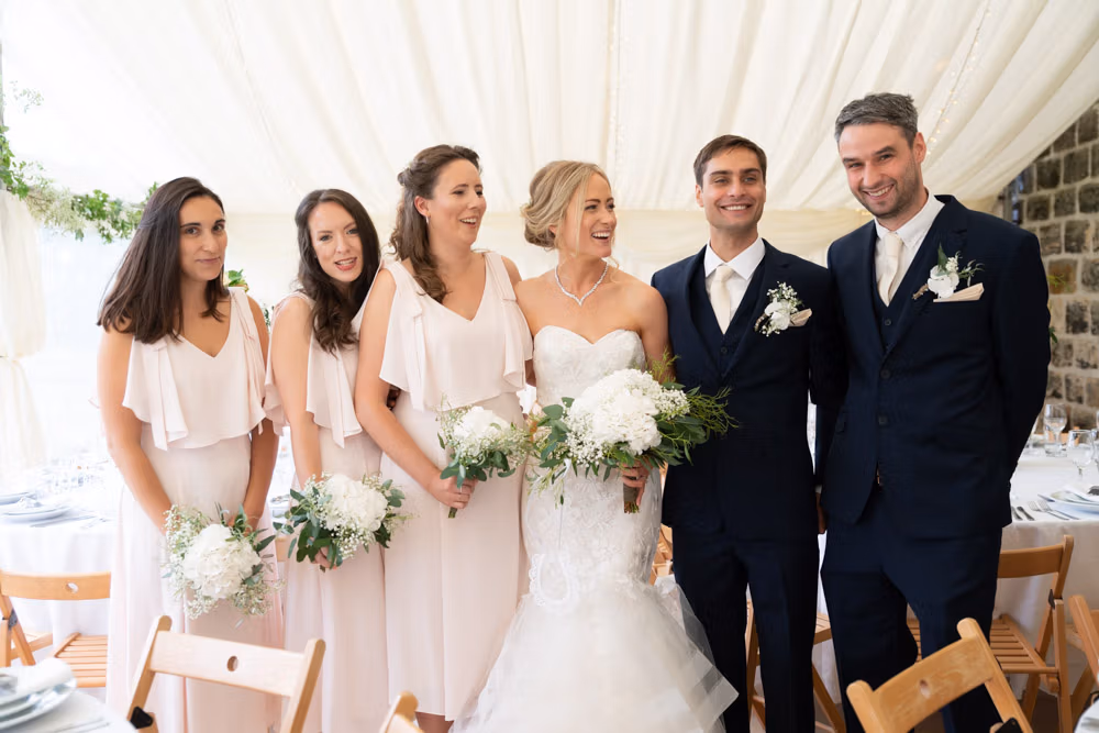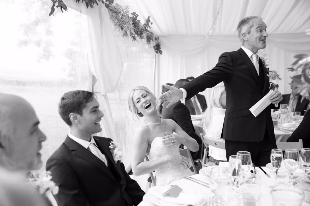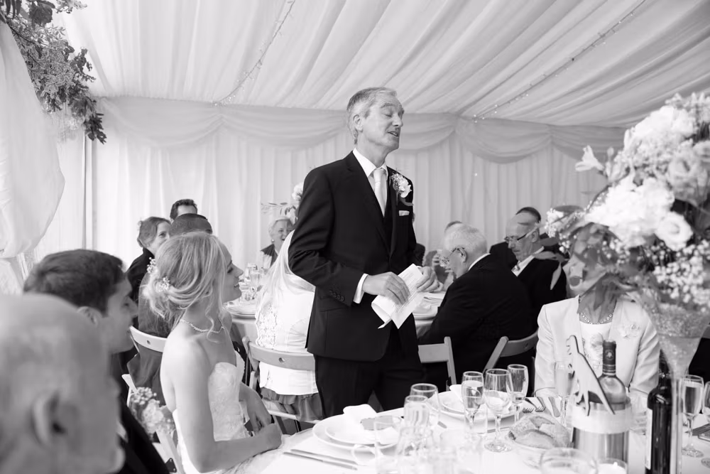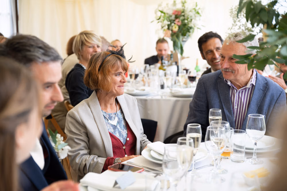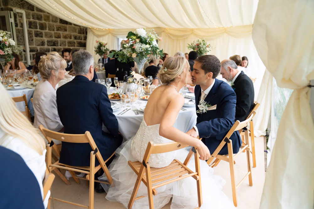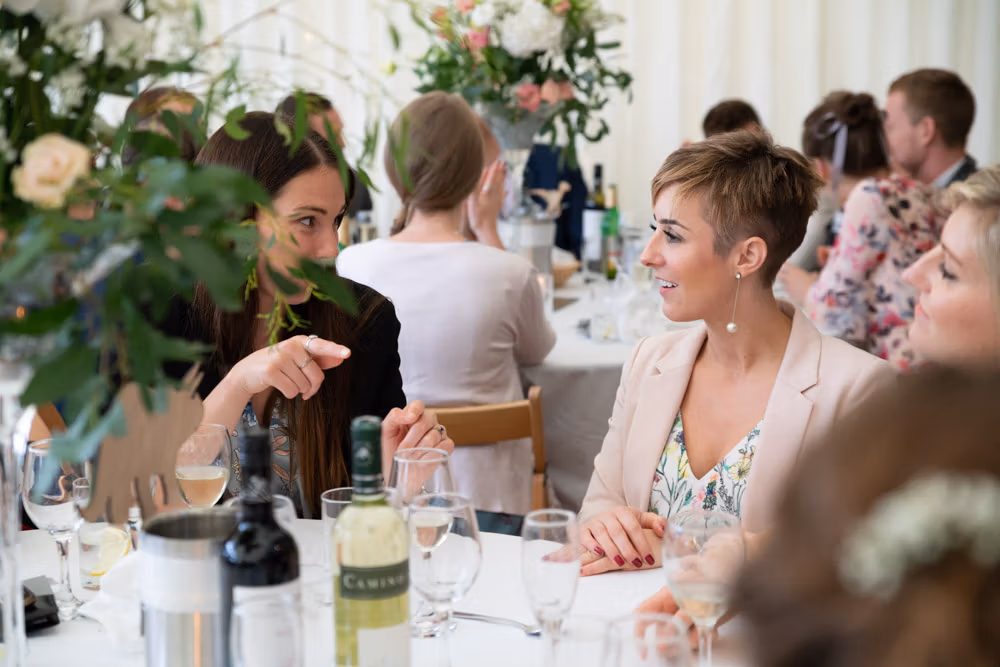 With the marquee set below the barn, the wedding breakfast at The Chilli Barn felt warm, relaxed, and full of atmosphere. Glasses clinked, stories were shared, and the room filled with laughter as friends and family gathered together.