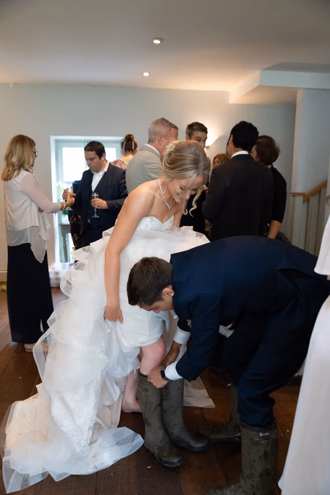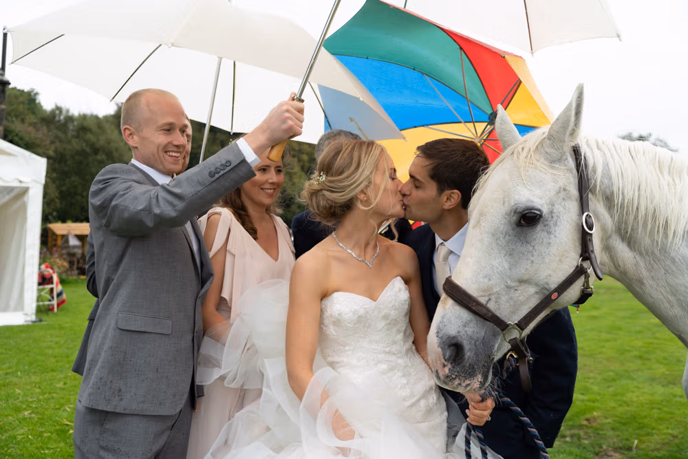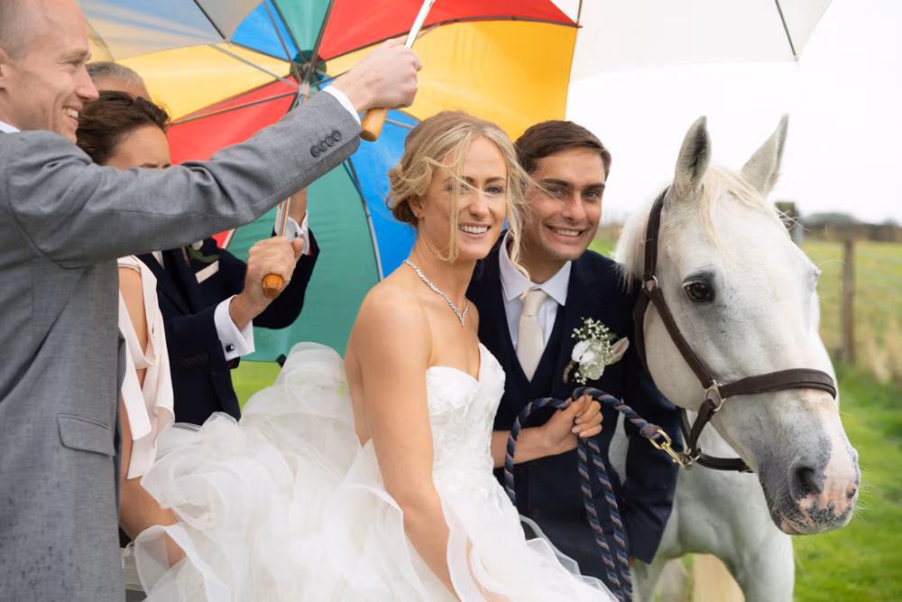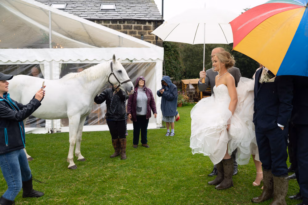It naturally followed on from the ceremony and flowed into the next part of the day as Helen stepped into her wellies and, with umbrellas from the groomsmen, we headed outside into a warm summer shower for some planned portraits with their white horse, just beyond the fields near Chevin Forest.