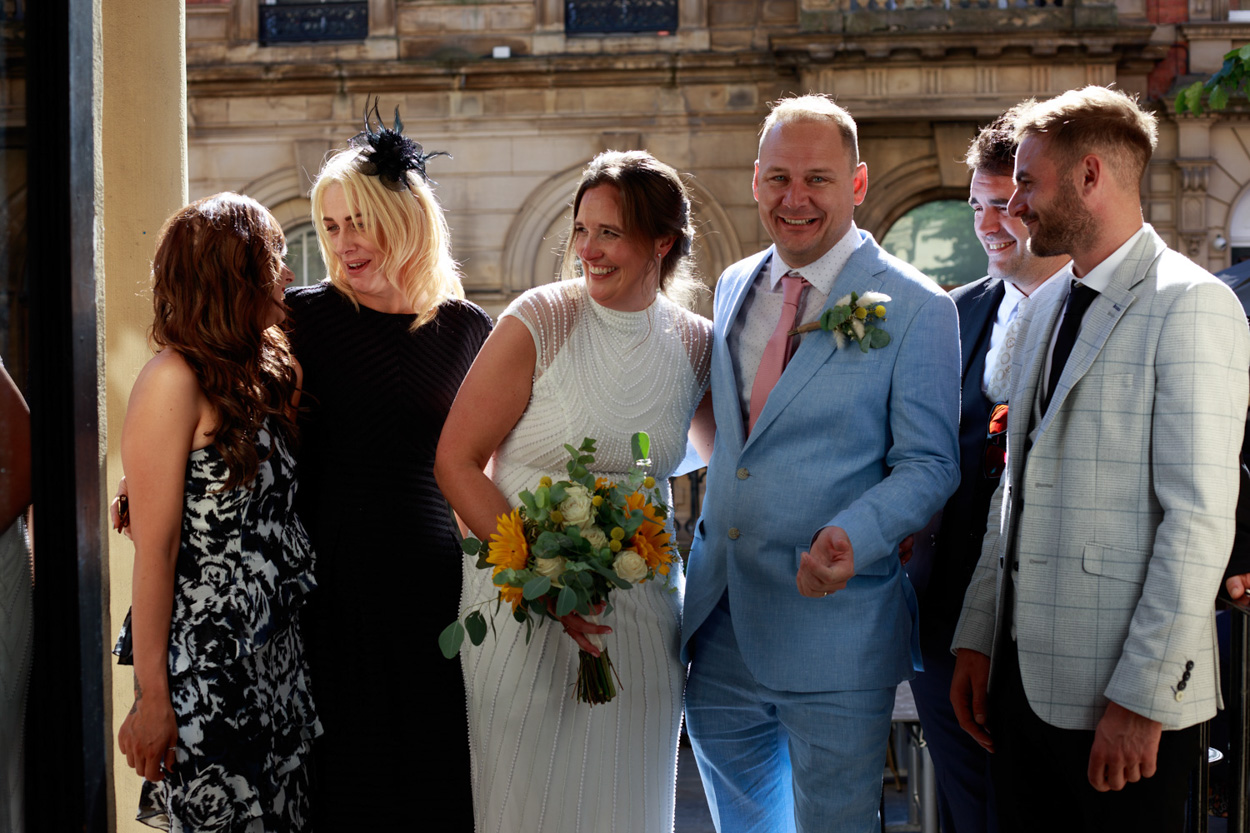 After the ceremony and the planned family and friends photos on Millennium Square, the guests made their way to the Lost & Found Leeds Club, while Gemma and Danny stayed for a natural couple portrait session — taking full advantage of the beautiful clear blue skies and sunshine, which made the white façade of Leeds Civic Hall glow. They first stopped to take a breath at the bar on the corner of the square. We then jumped in a taxi together to meet their friends and family. I captured some lovely shots en route, walking towards the club, and a perfect photo as the couple arrived at the steps.