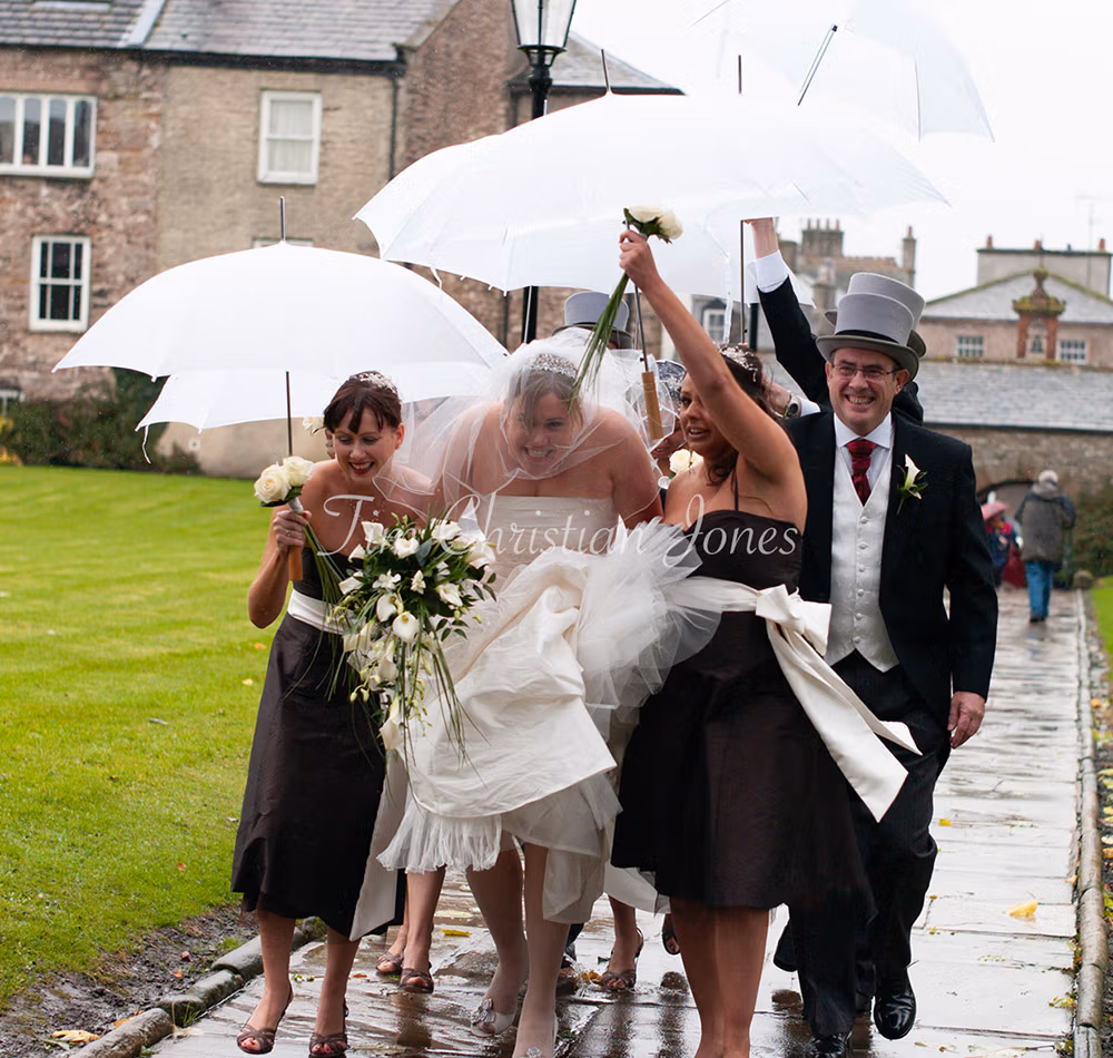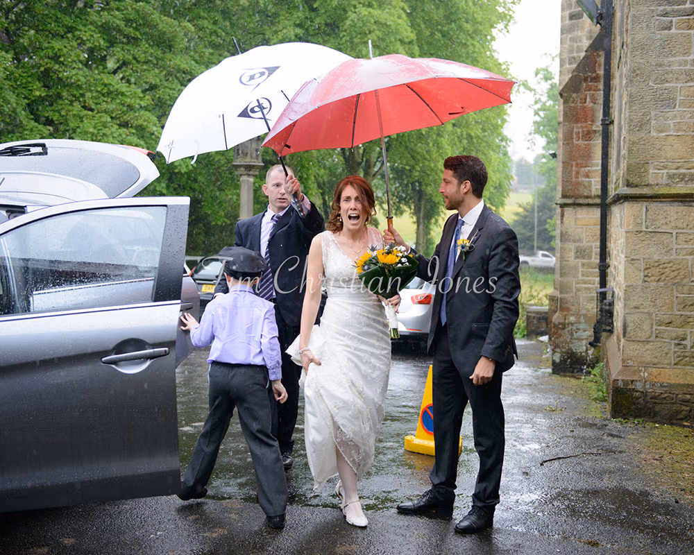 After the church ceremony, rain rolled across Pendle Hill as we arrived at Barley Village Hall. The plan had always been to step out for portraits, but the weather made the couple pause. We slowed things down, talked it through, and decided to stick with it. With a groomsman holding umbrellas and plenty of laughter in between, the photographs became about the experience as much as the view. The rain stayed — and so did the moments that mattered.