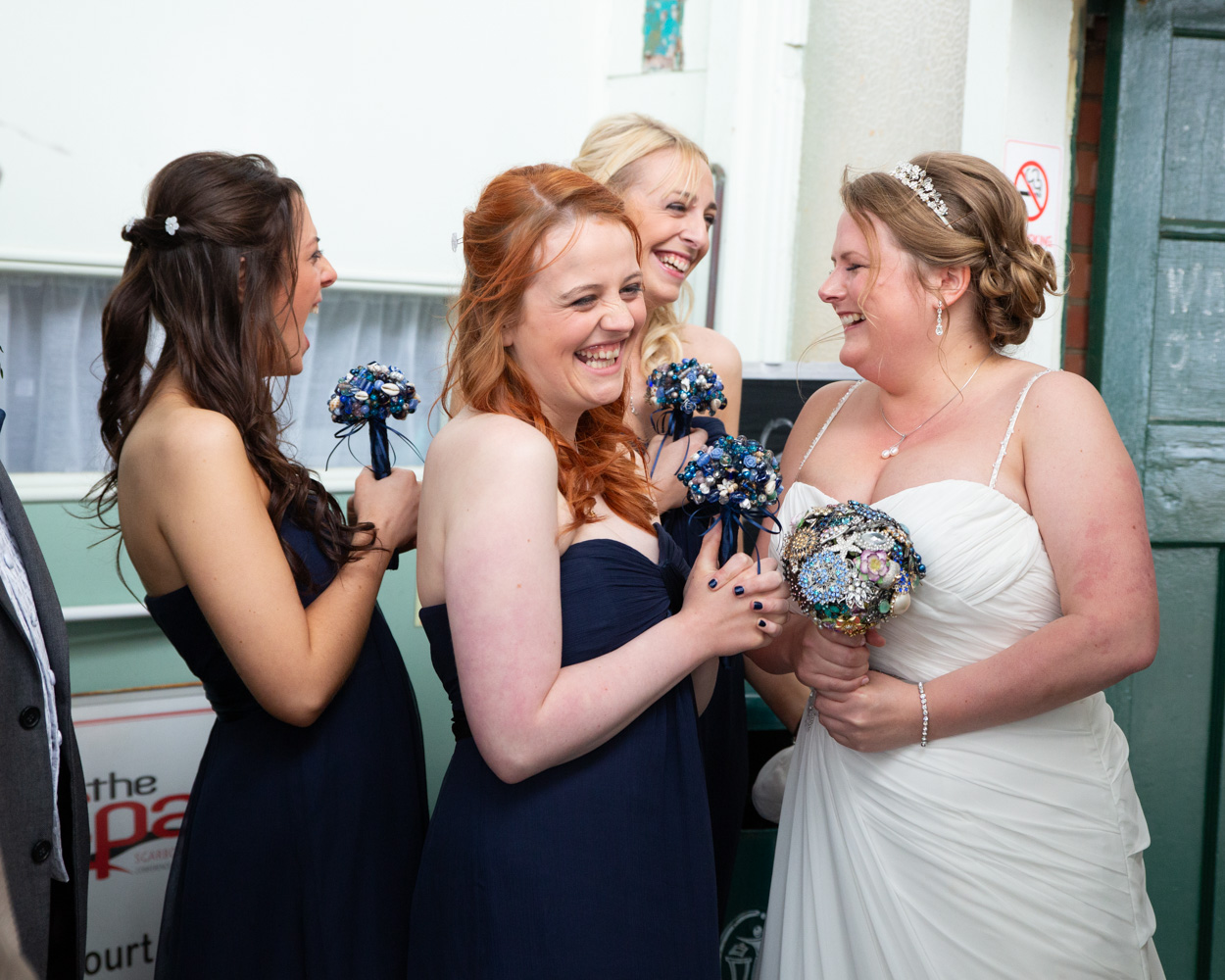 Lisa arrived with her bridesmaids and parents on the promenade, walking together toward Scarborough Spa as the wind lifted dresses and carried laughter along the seafront. They passed through the tunnel beneath the cliffs — that familiar Scarborough moment where the light drops briefly before opening out again.
