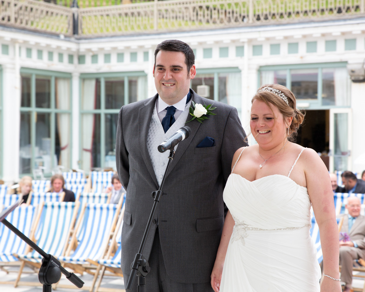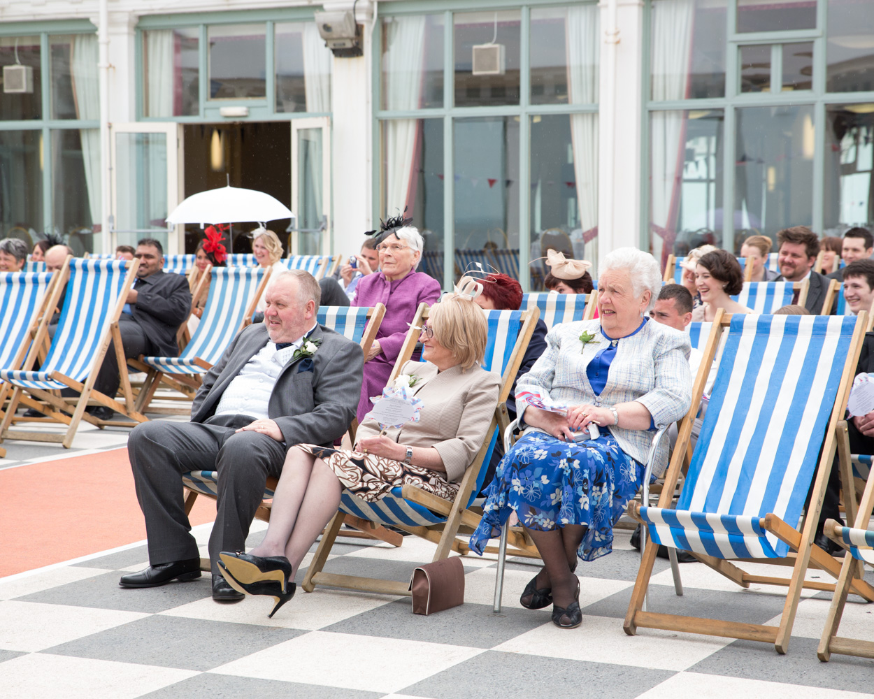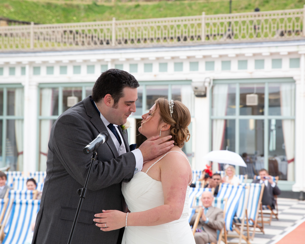 The ceremony took place outdoors, framed by the Victorian grandeur of Scarborough Spa and the steep hillside rising behind them. Guests sat in deckchairs, wrapped in sea air and anticipation, the setting feeling timeless and unmistakably seaside.