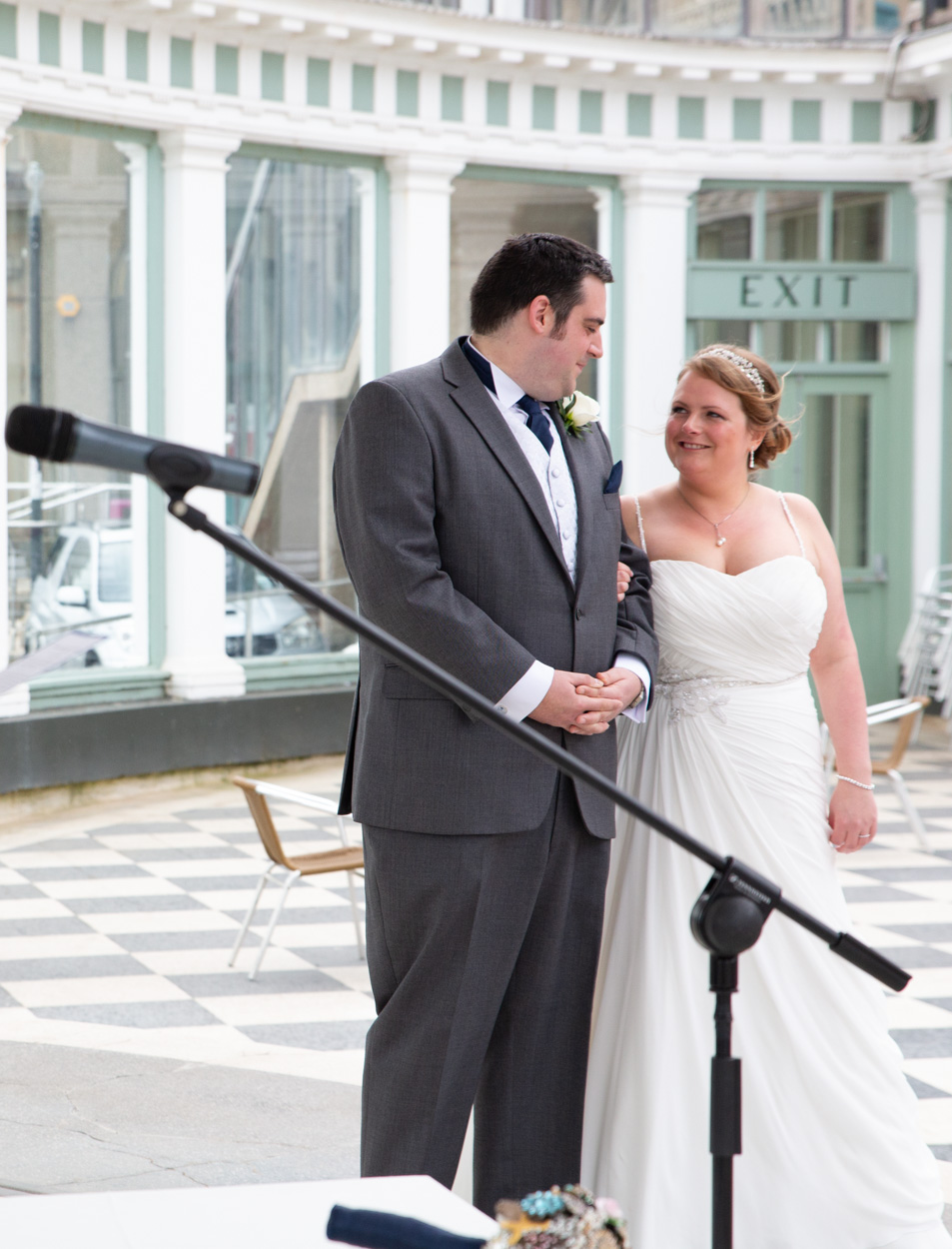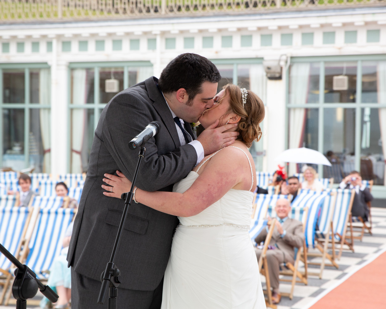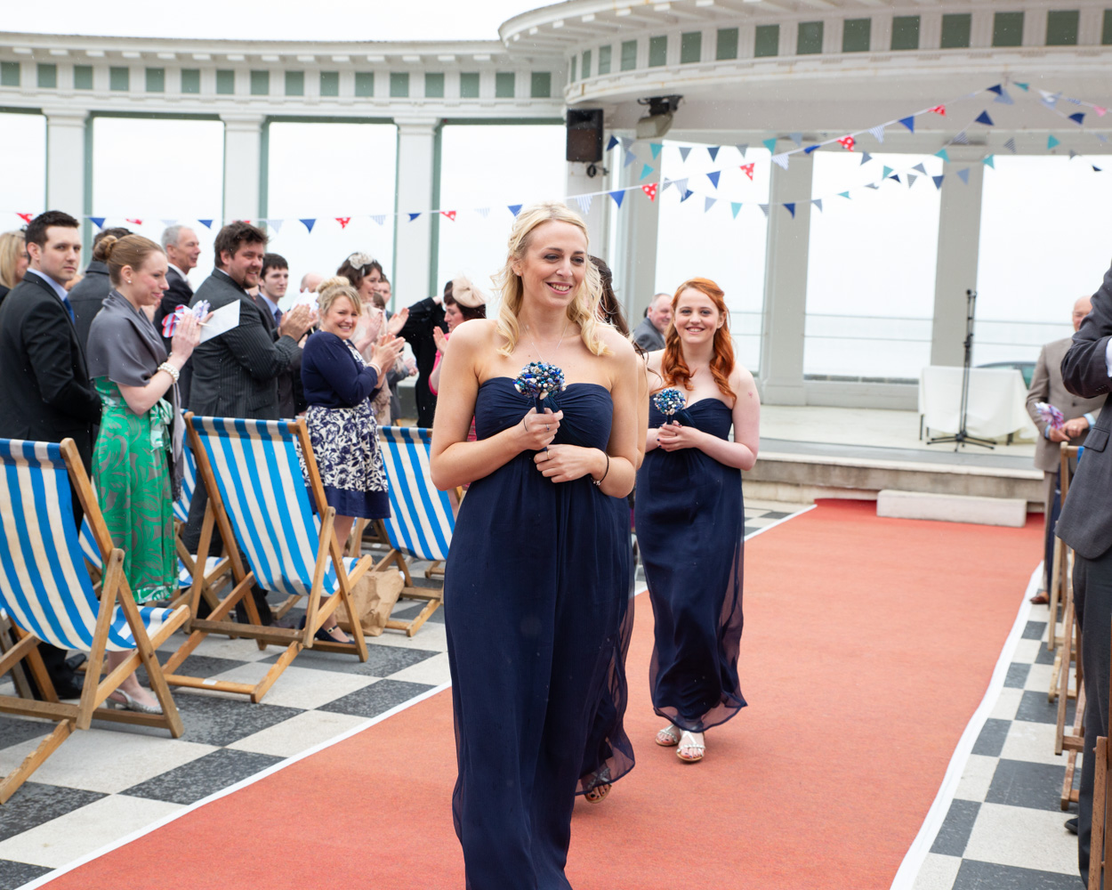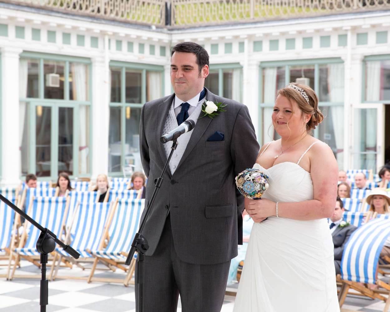 The ceremony took place outdoors, framed by the Victorian grandeur of Scarborough Spa and the steep hillside rising behind them. Guests sat in deckchairs, wrapped in sea air and anticipation, the setting feeling timeless and unmistakably seaside.