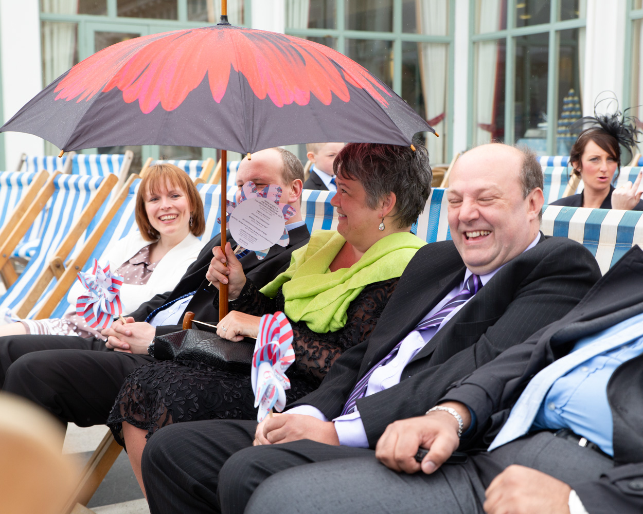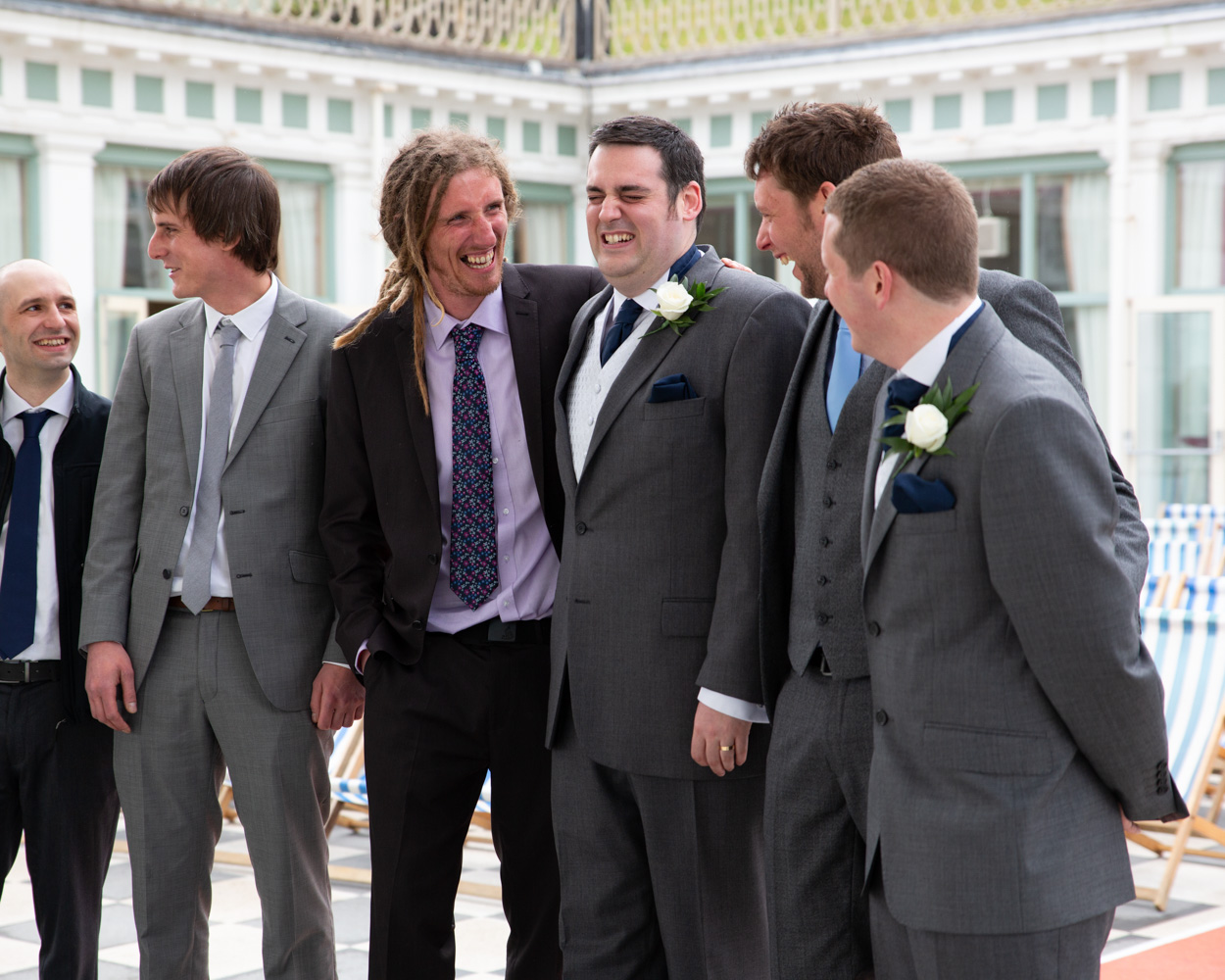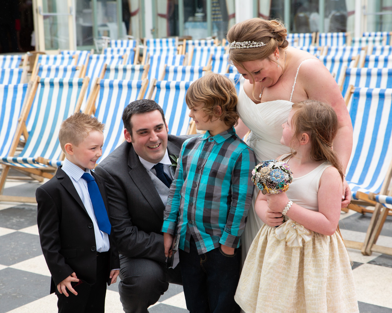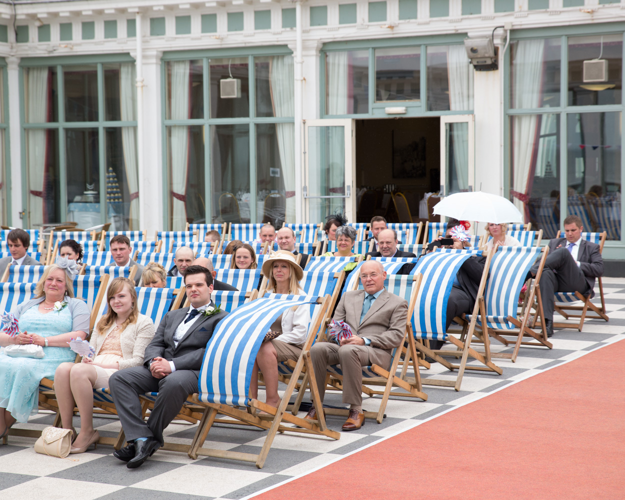 With the deckchairs and the Spa framing everything perfectly, the photos felt natural and unforced. Family gathered easily, laughter slipped in between frames, and the mood stayed playful — exactly right for a May wedding by the sea.