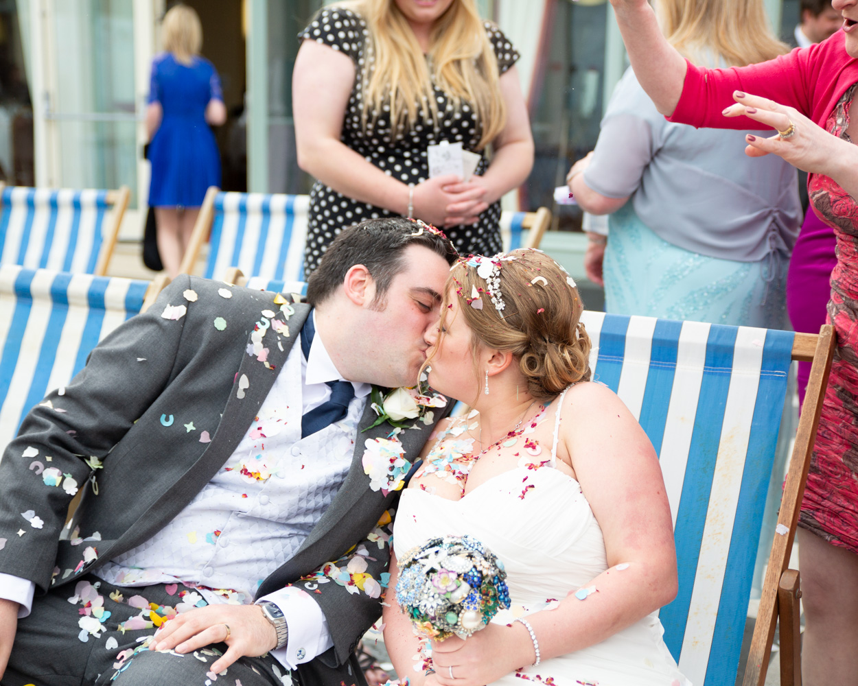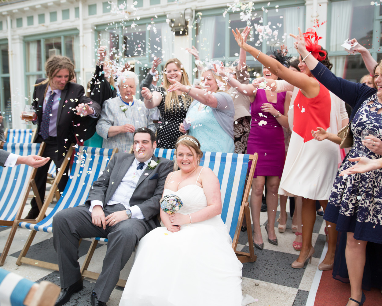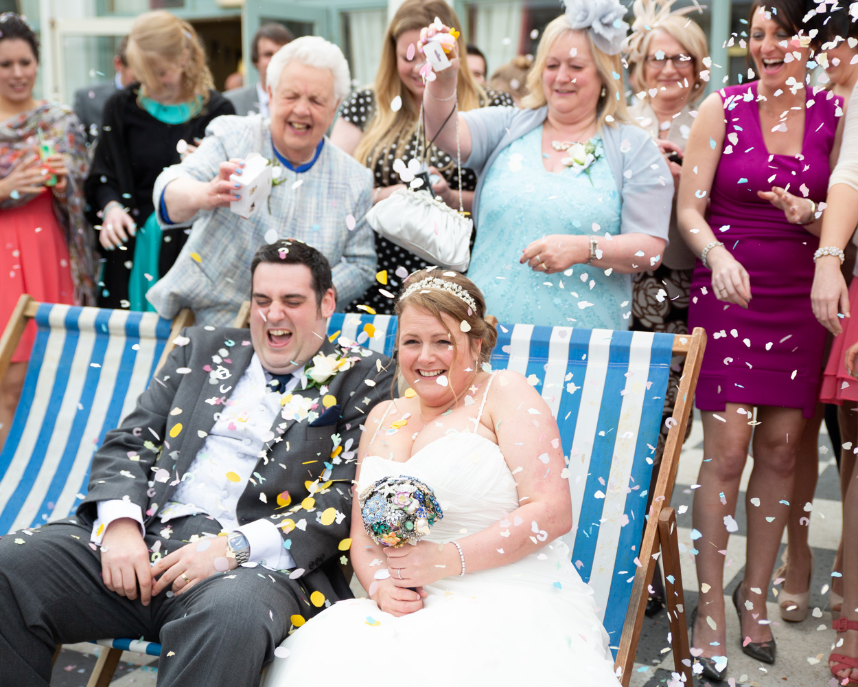 Lisa and Oliver took their seats right in the middle of the deckchairs, guests lining up behind them, confetti at the ready. The breeze — perfectly timed — carried it forward in a joyful swirl. A burst of colour, cheers all around, and a kiss right at the centre of it all.