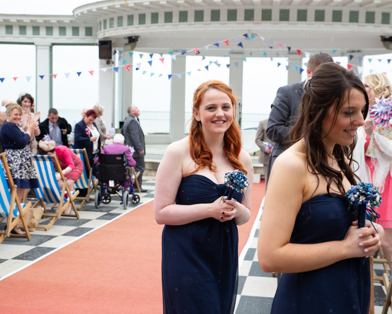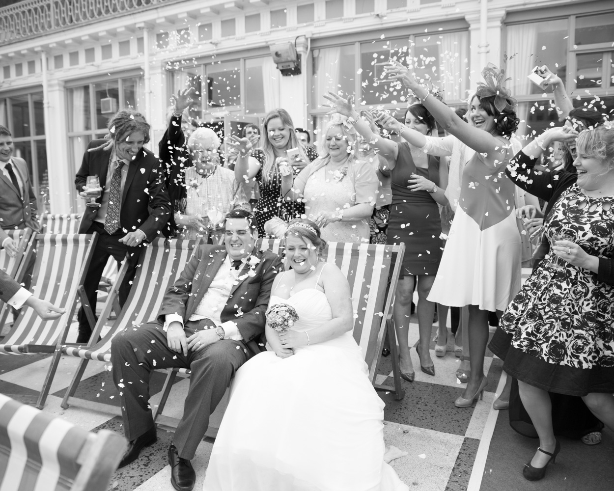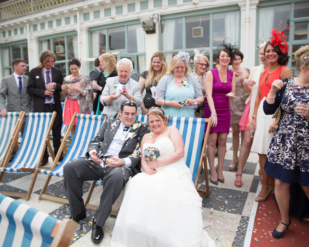 Lisa and Oliver took their seats right in the middle of the deckchairs, guests lining up behind them, confetti at the ready. The breeze — perfectly timed — carried it forward in a joyful swirl. A burst of colour, cheers all around, and a kiss right at the centre of it all.