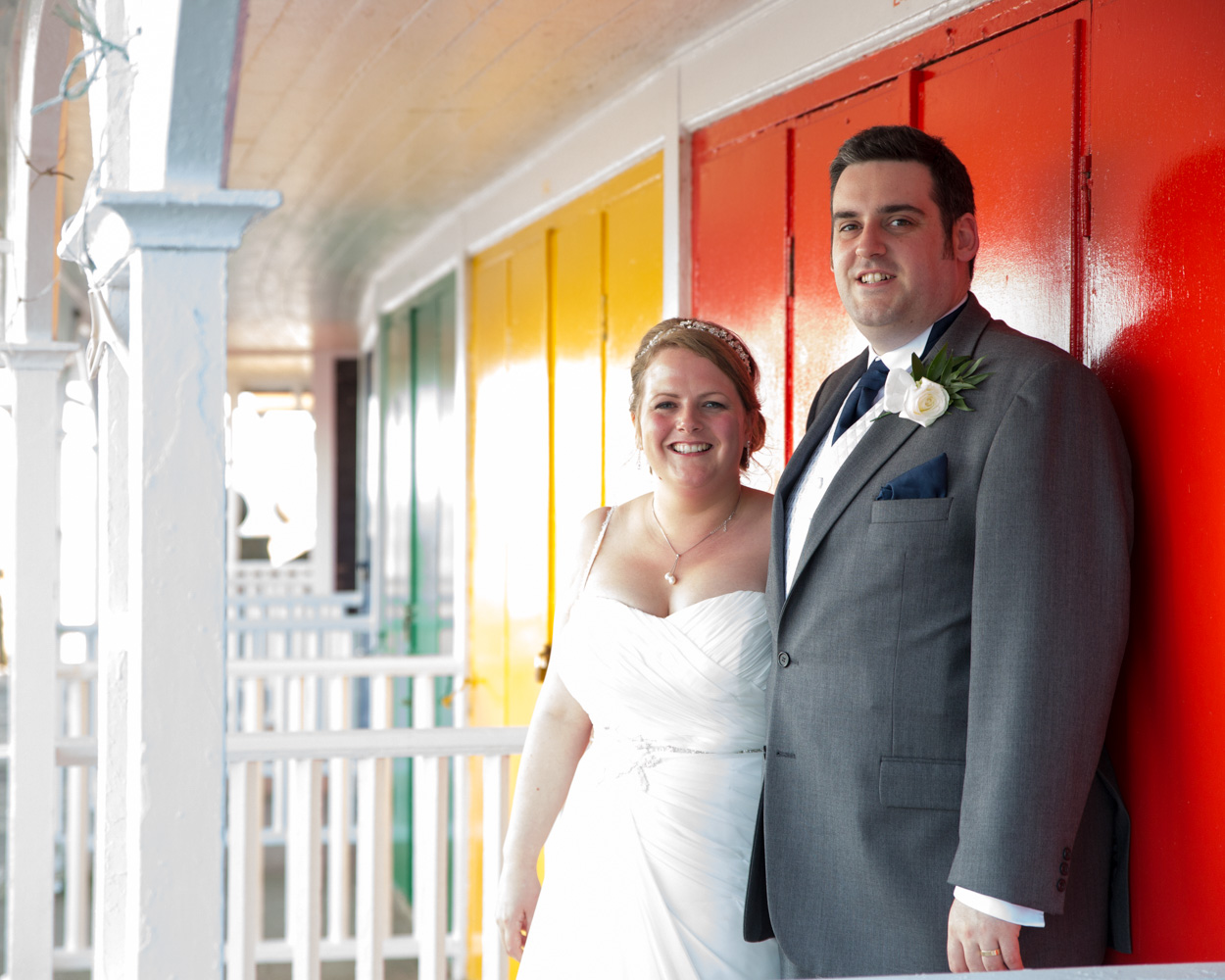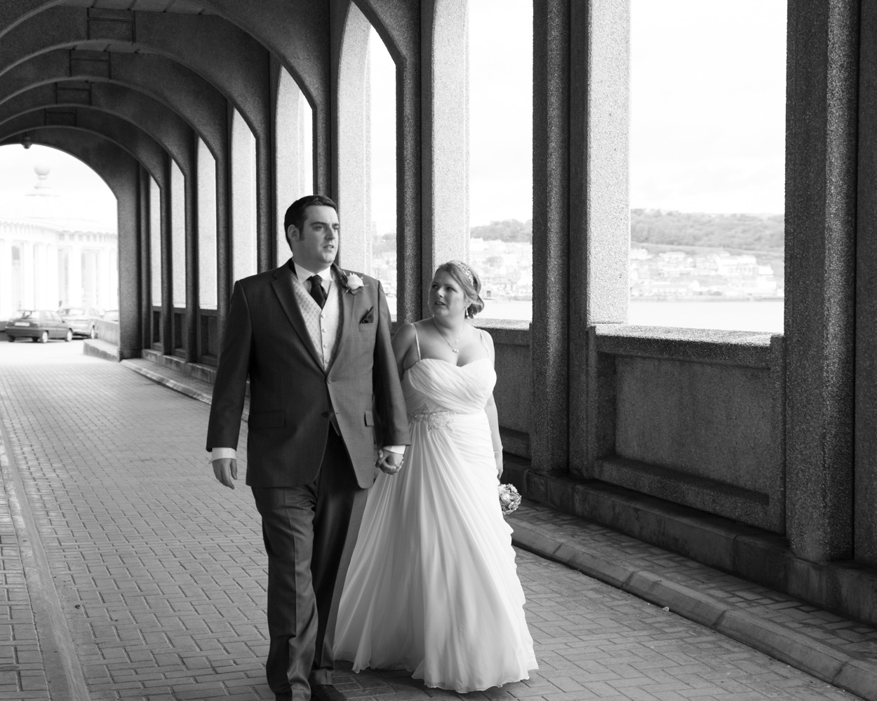 With no shortage of backdrops, we stepped straight outside and across the road for their couple portraits. Victorian railings and old lampposts lined the promenade, while the sandy beach and calm sea stretched out below. Moody skies rolled overhead, framing the coast perfectly.