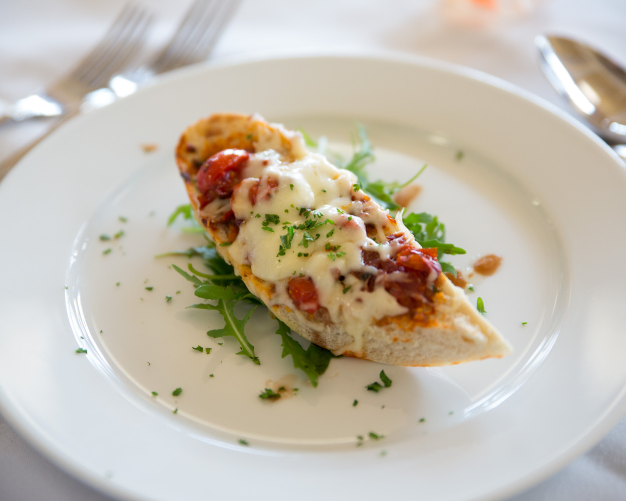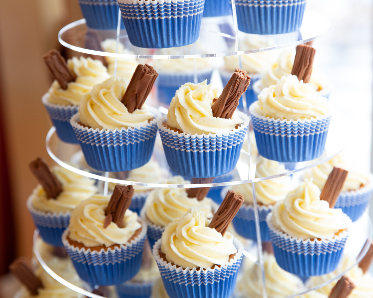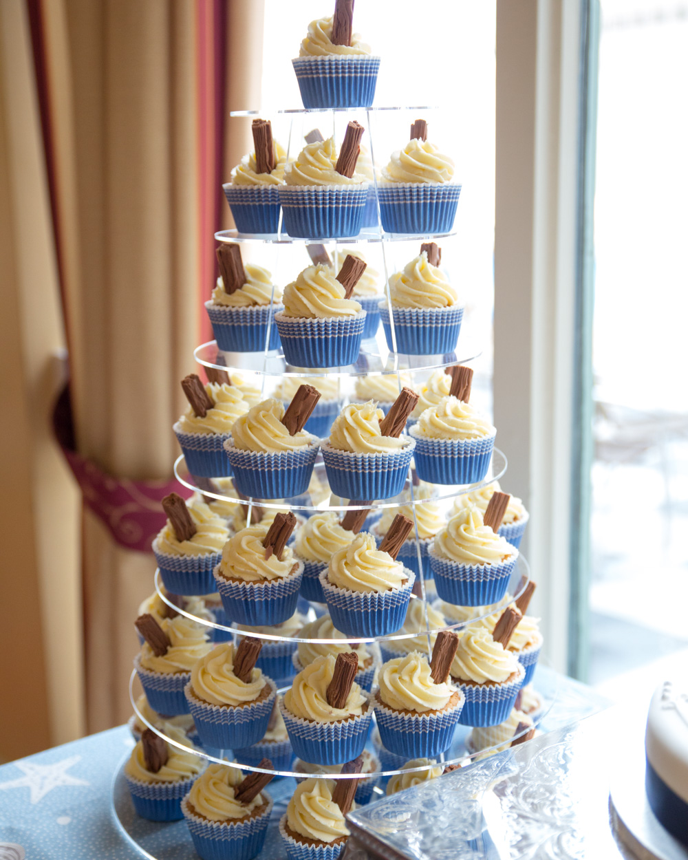 The wedding breakfast leaned fully into the seaside spirit. To begin, baguette with cheese and tomato salad was served around the tables, while nearby a tower of 99-flake–style cupcakes and a simple wedding cake sat waiting — finished with delicate shell details in the icing and photographed quietly before the room filled.