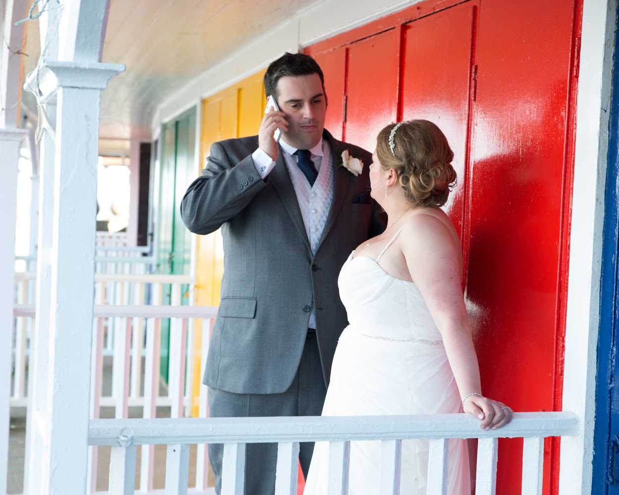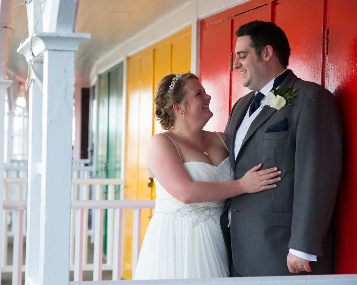 Later in the day, we stepped back outside for another short set of couple portraits — this time by the colourful beach cabins, along the promenade, and down toward the shoreline as the tide had fully come in.