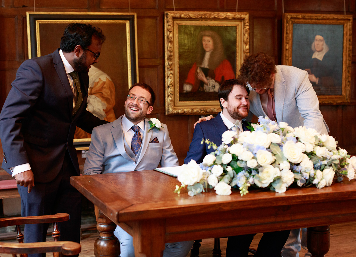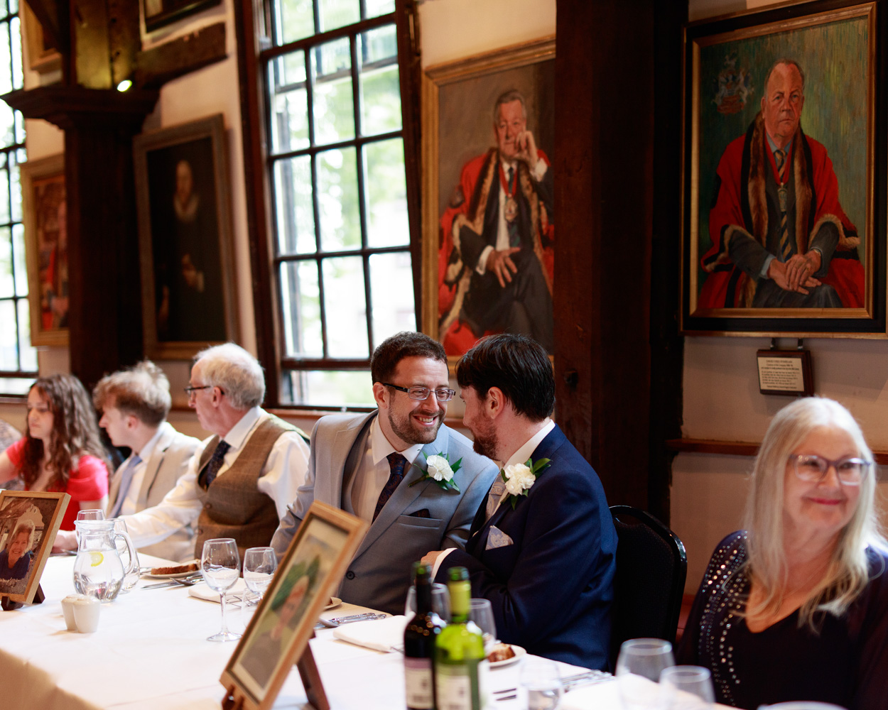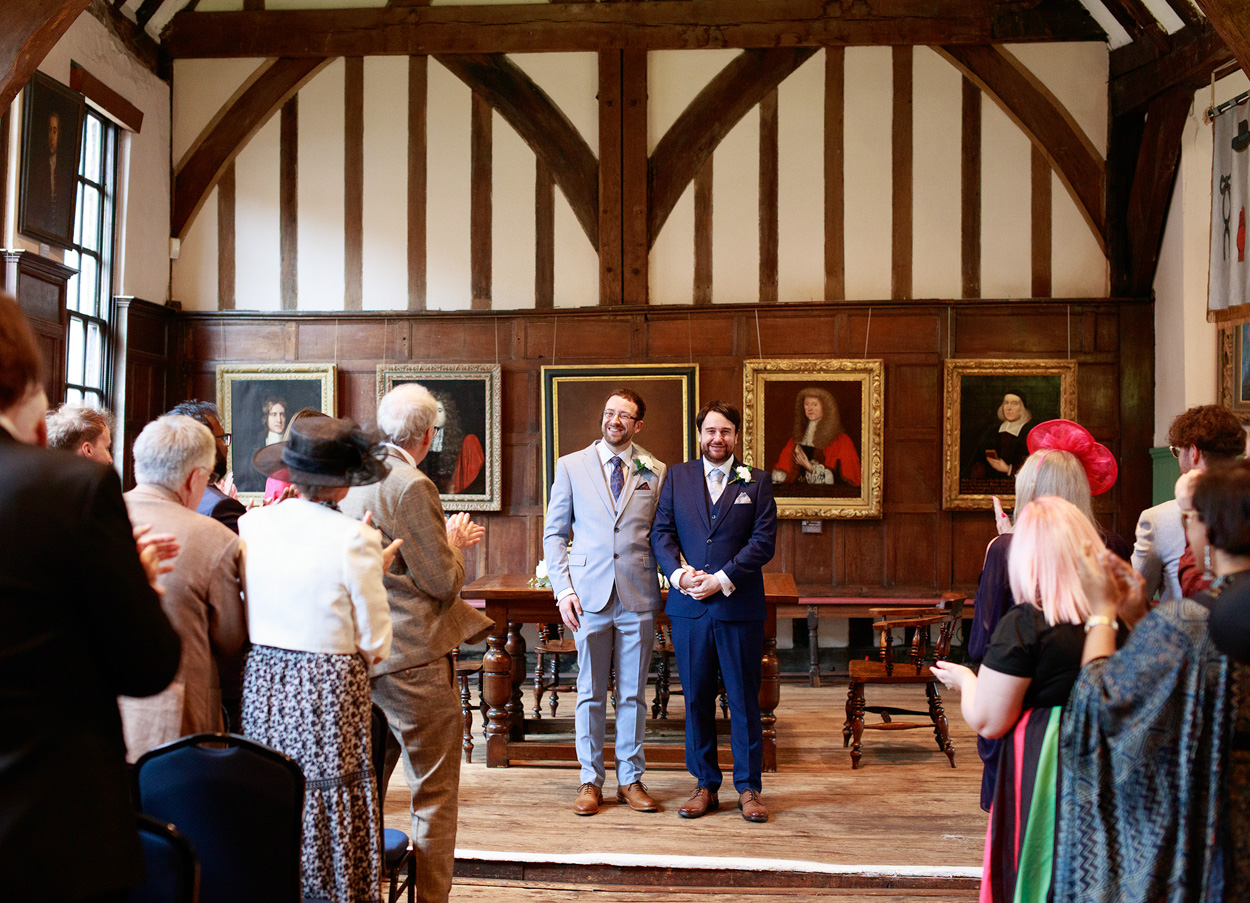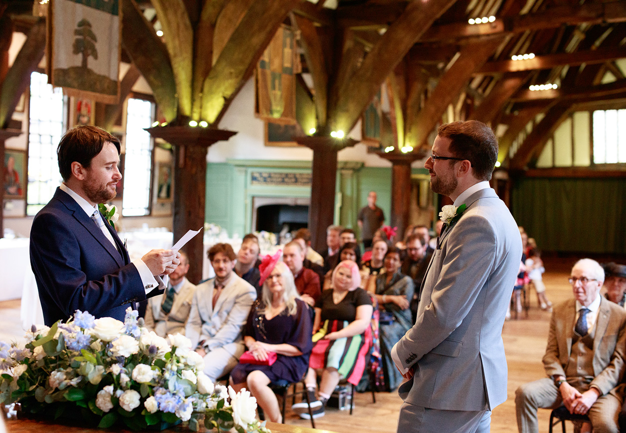 The ceremony itself took place within the Hall’s grand timbered space, its scale softened by the presence of close friends and family. Chris and David chose to include more ceremony photographs than I’ve seen for many couples — a reflection of how much those moments meant to them.