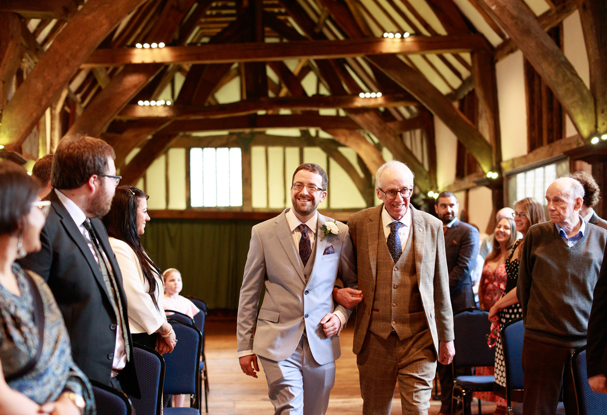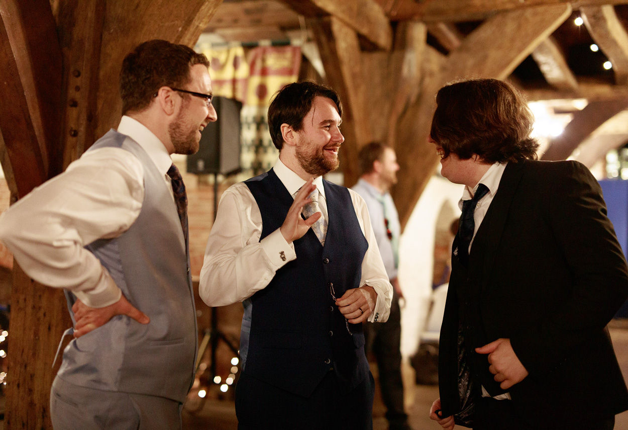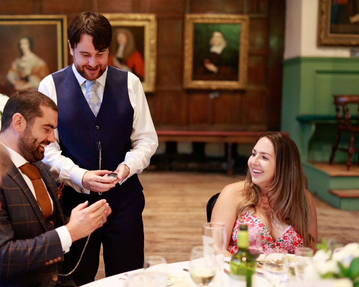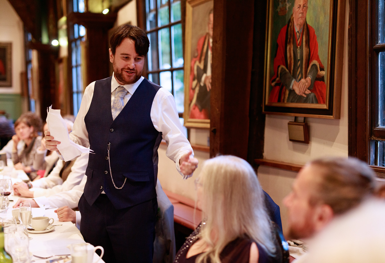The ceremony itself took place within the Hall’s grand timbered space, its scale softened by the presence of close friends and family. Chris and David chose to include more ceremony photographs than I’ve seen for many couples — a reflection of how much those moments meant to them.