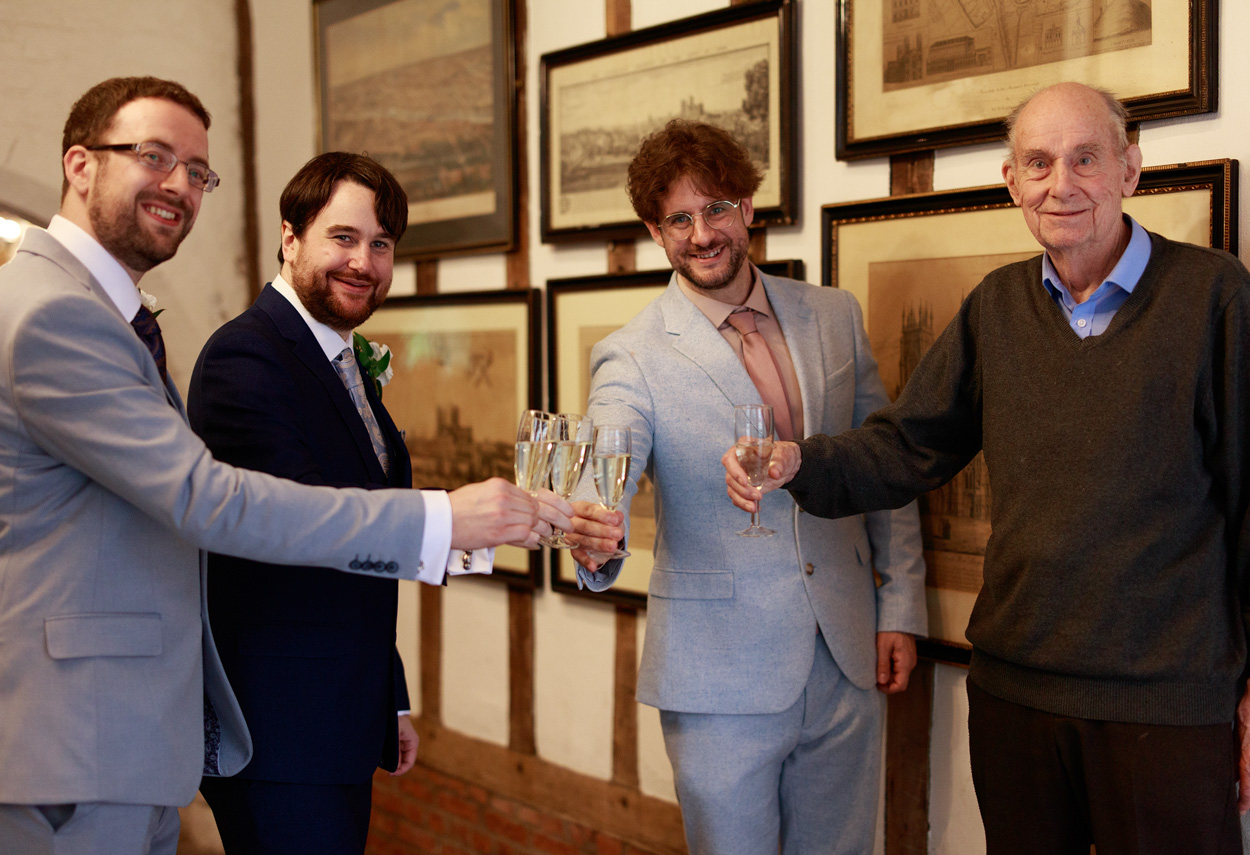 My connection to the day stretched back several years. In 2017, I photographed Sampurna and Joe’s wedding at the same Hall — an Asian–English fusion celebration full of colour, family, and shared history. Chris was best man that day. Years later, when Chris and David began planning their own wedding, Joe stood beside them in return. Through those shared friendships and moments, they found their way back to Merchant Adventurers’ Hall — and back to me.