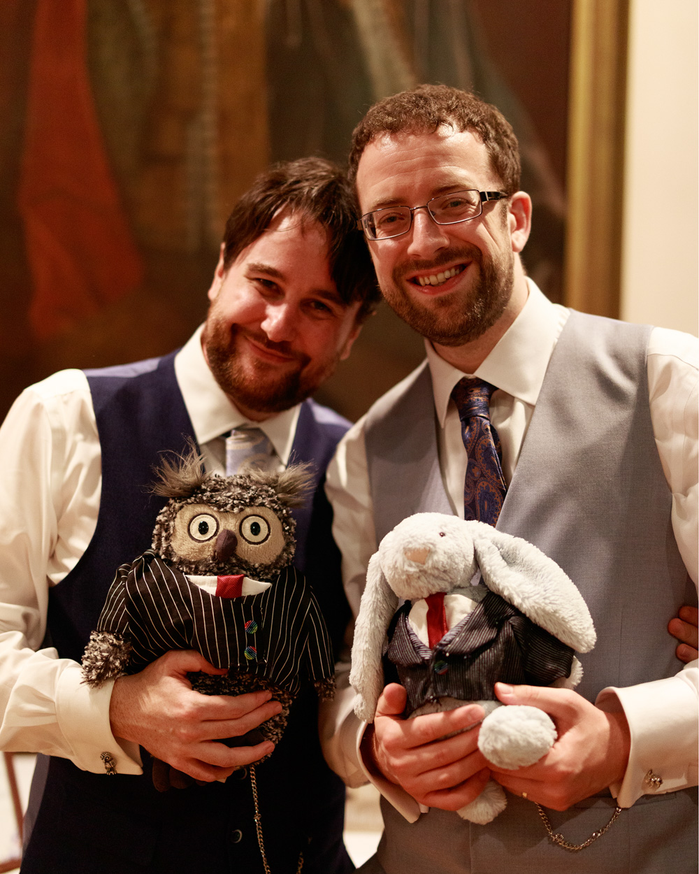 Chris and David moved between tables, greeting guests and sharing time with those who had gathered for them. During a brief pause, we captured photographs of their rings, engraved pocket watches, and a pair of owl and rabbit soft toys — small details that carried personal significance.