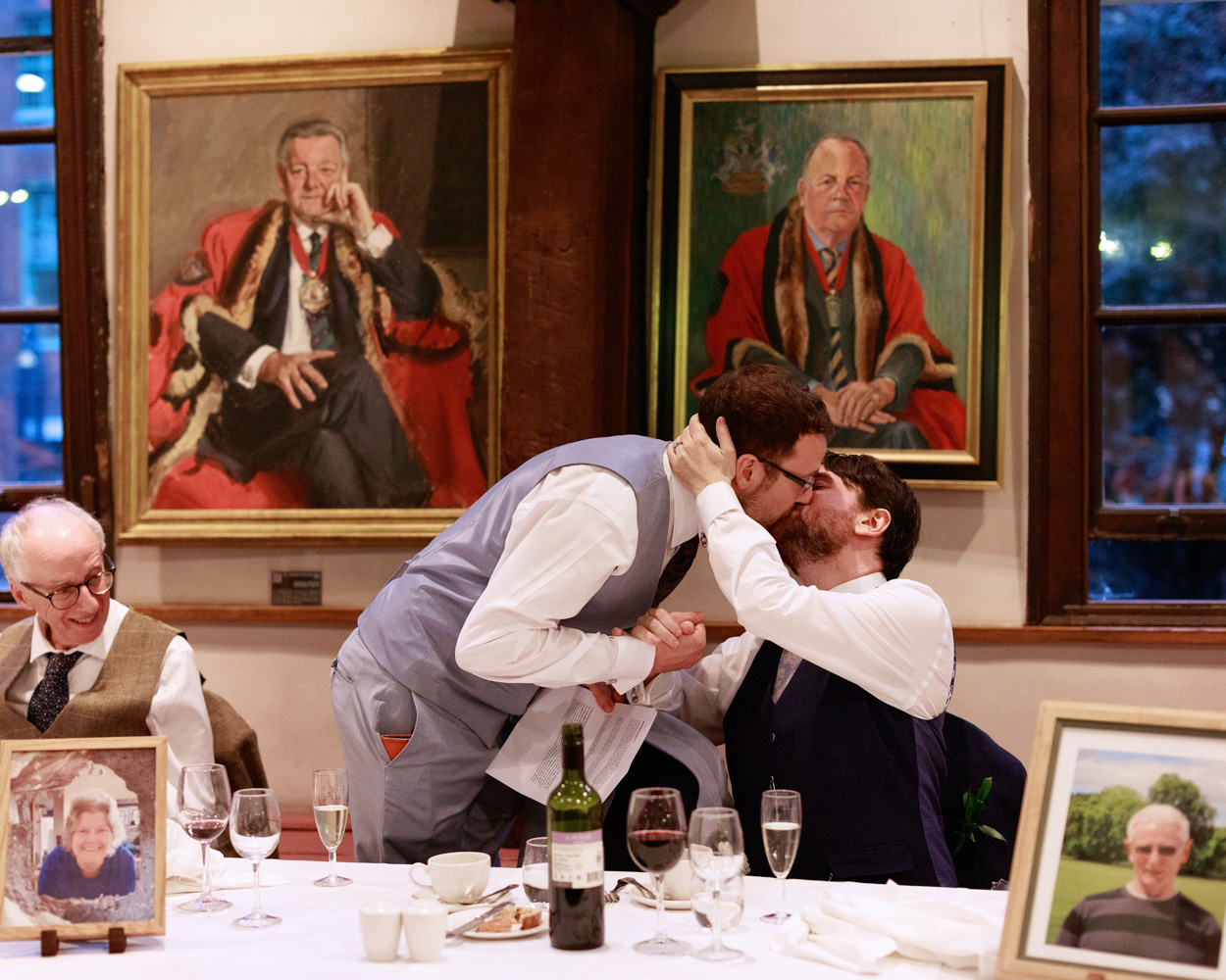 The wedding breakfast brought a shift in focus, with moments unfolding quietly around the room. Photographs of lost parents placed on the top table held particular meaning, as did portraits of each groom with their respective parent — moments full of care and reflection.