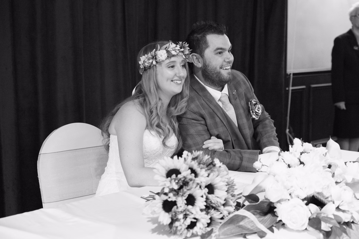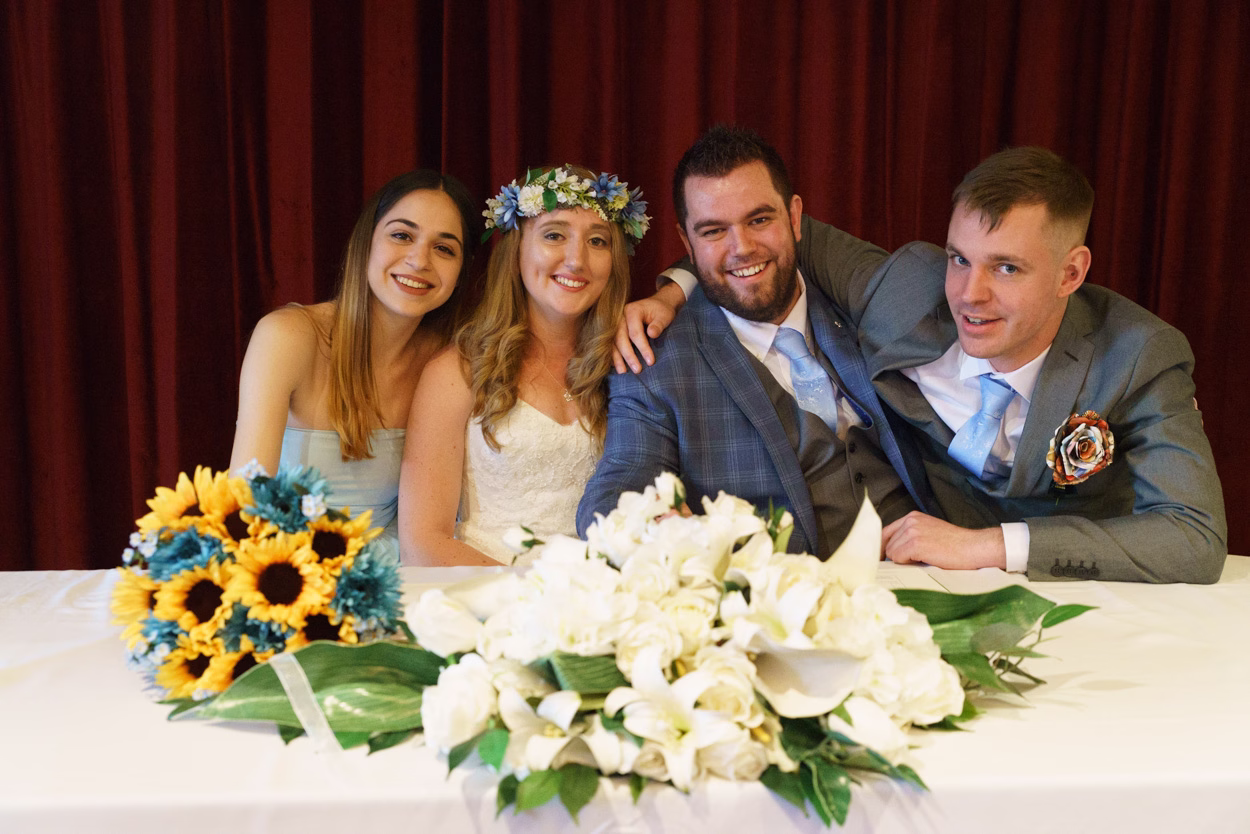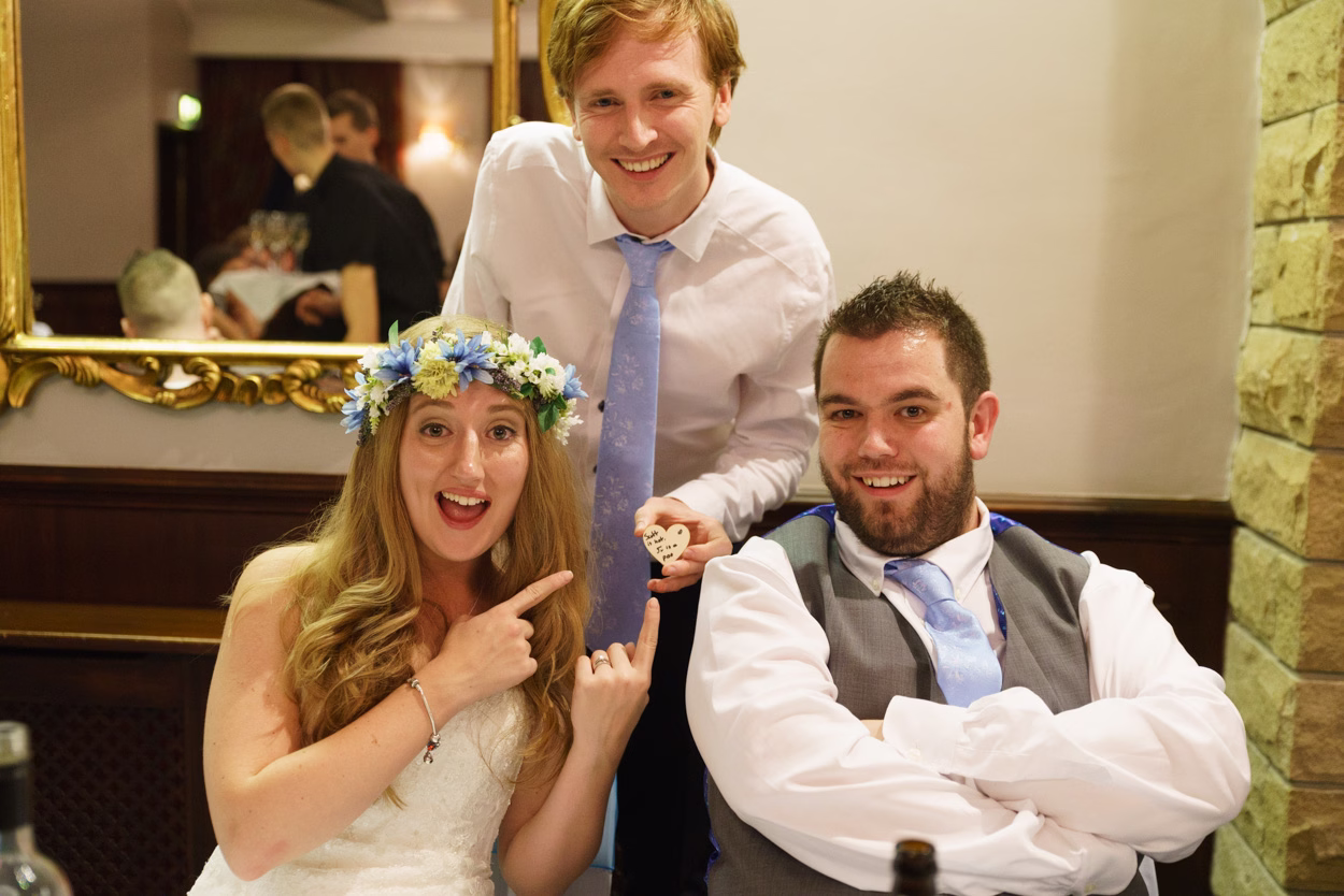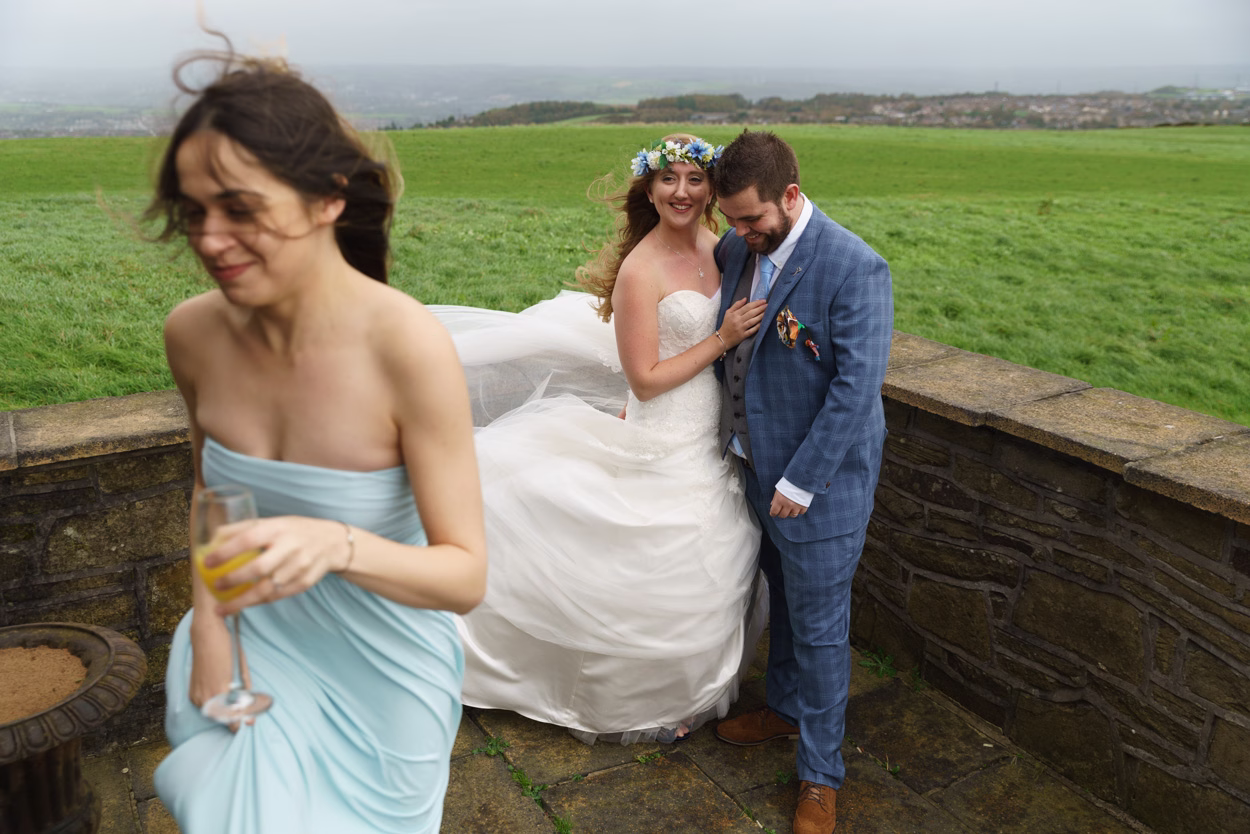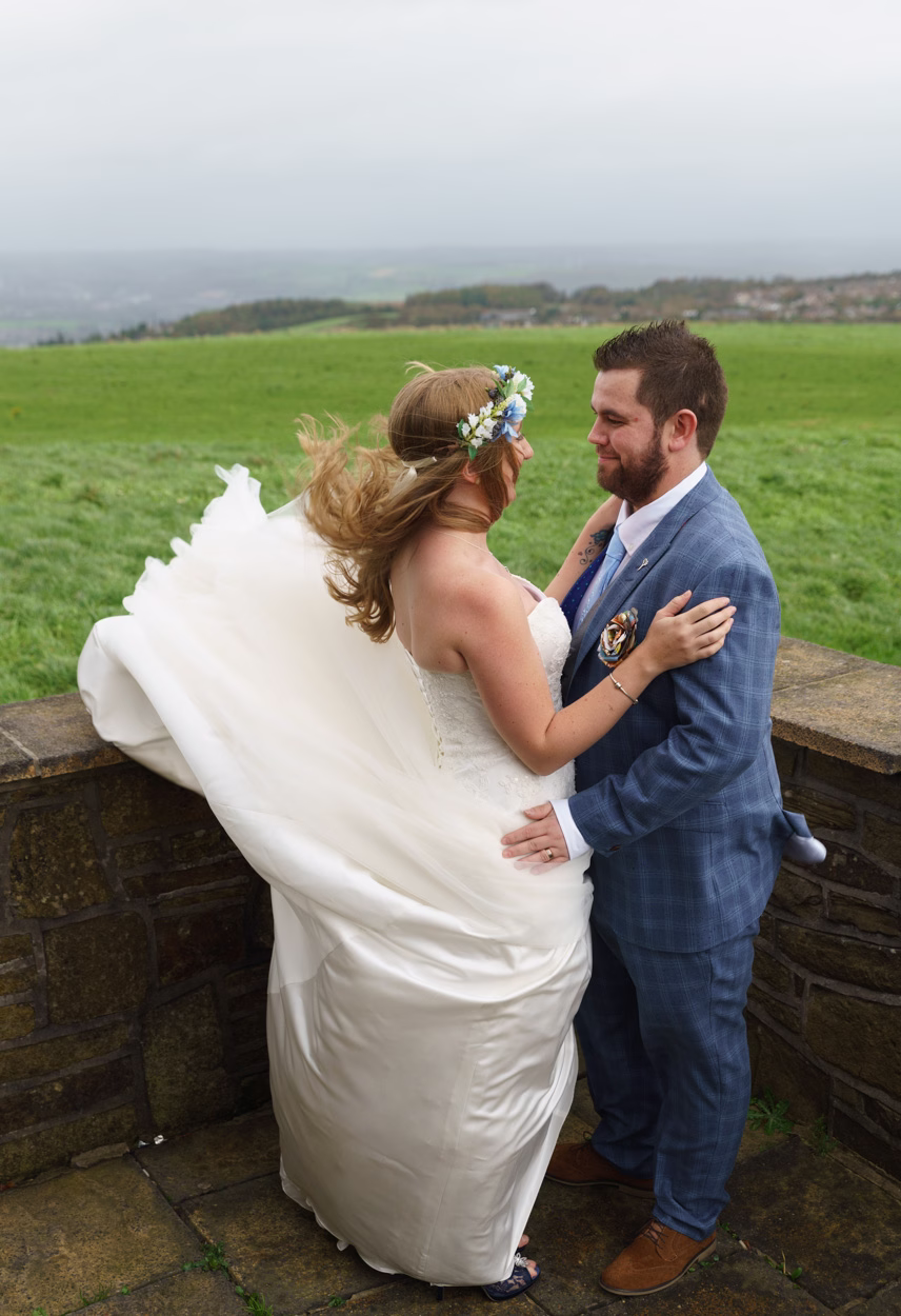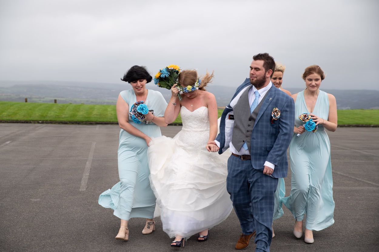 Julia and Scott were absolute stars on their October wedding at Pennine Manor Hotel in Huddersfield. The wind was wild, yet the couple—and all their guests—bravely ventured onto the helipad for the planned group photo. Hats off to everyone for embracing the gusts!