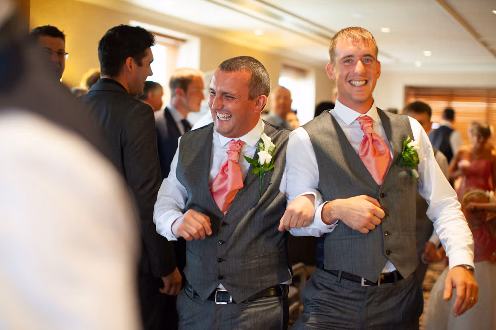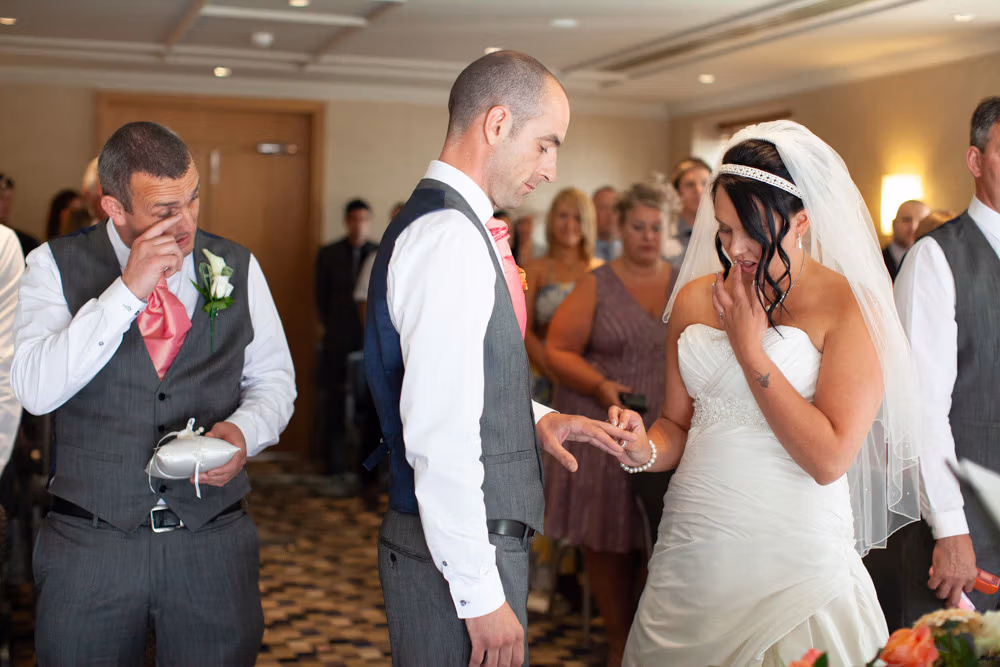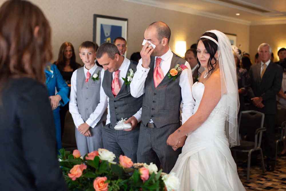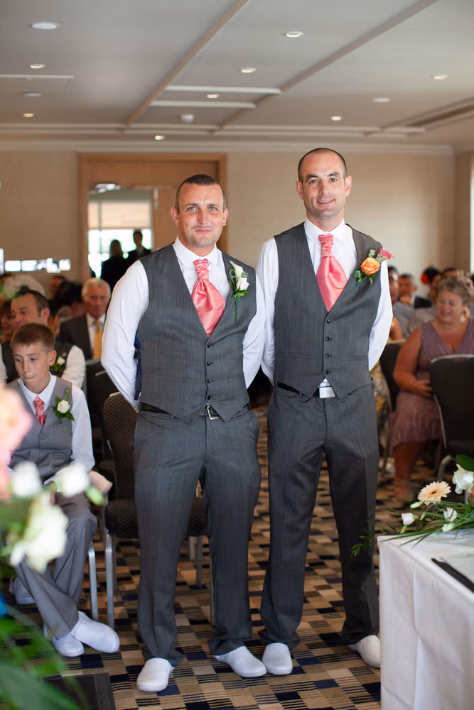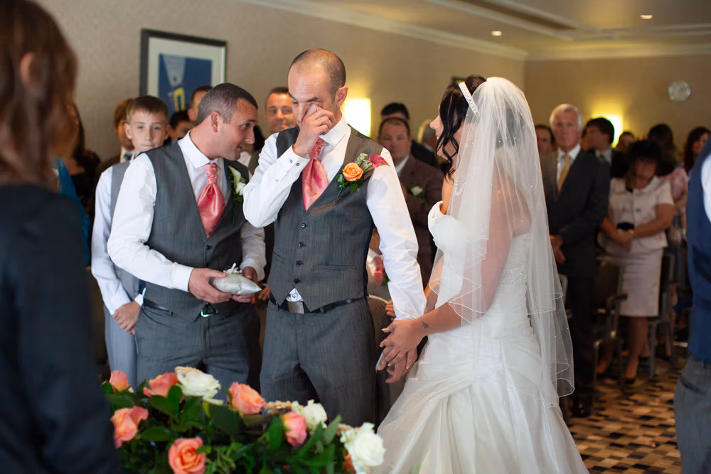 The ceremony room was filled with anticipation and quiet excitement. The groomsmen, dressed in sharp grey suits and bright white shoes, shared easy laughs that helped break the tension. Standing alongside his best man, Dave tried to keep calm, but his eyes said it all.