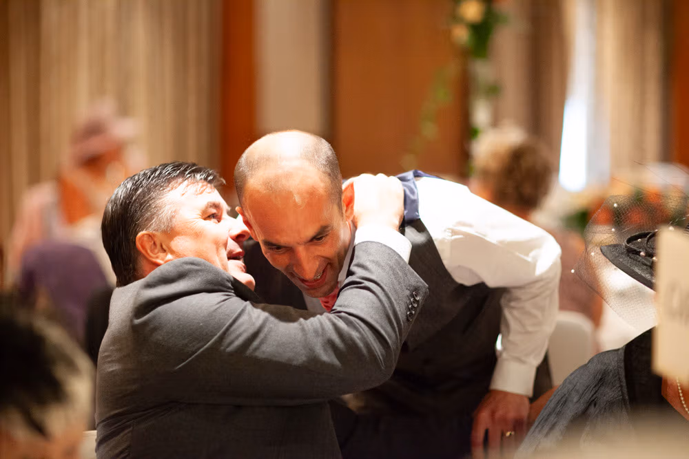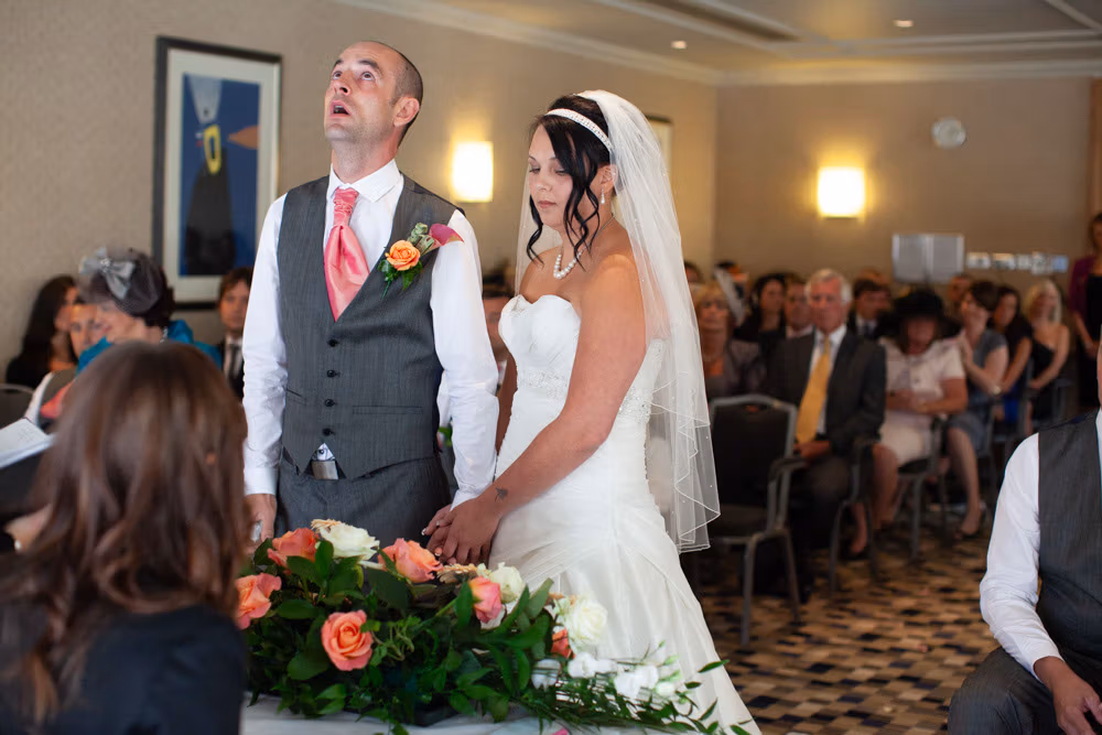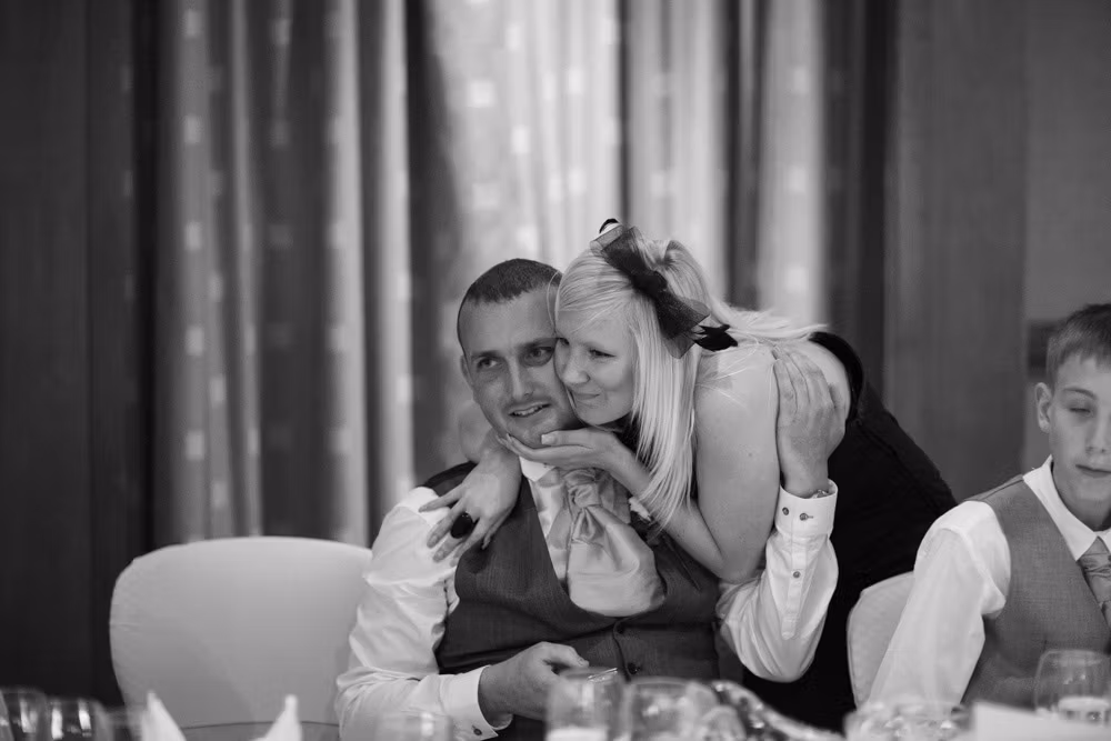Once the register was signed, everyone flowed into the adjoining room — a space alive with chatter, smiles, and that first wave of post-ceremony relief. I caught Gemma and Dave sharing a quiet kiss in the middle of it all, a little pause just for them.
