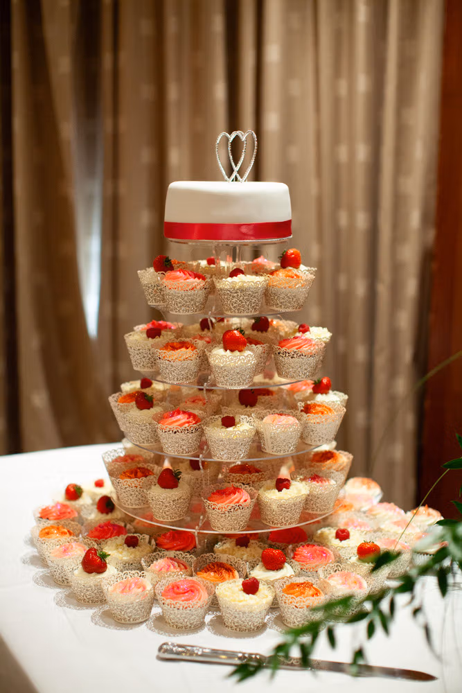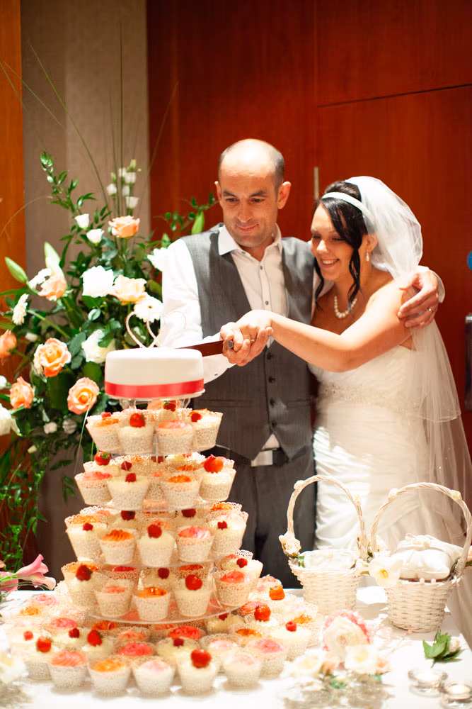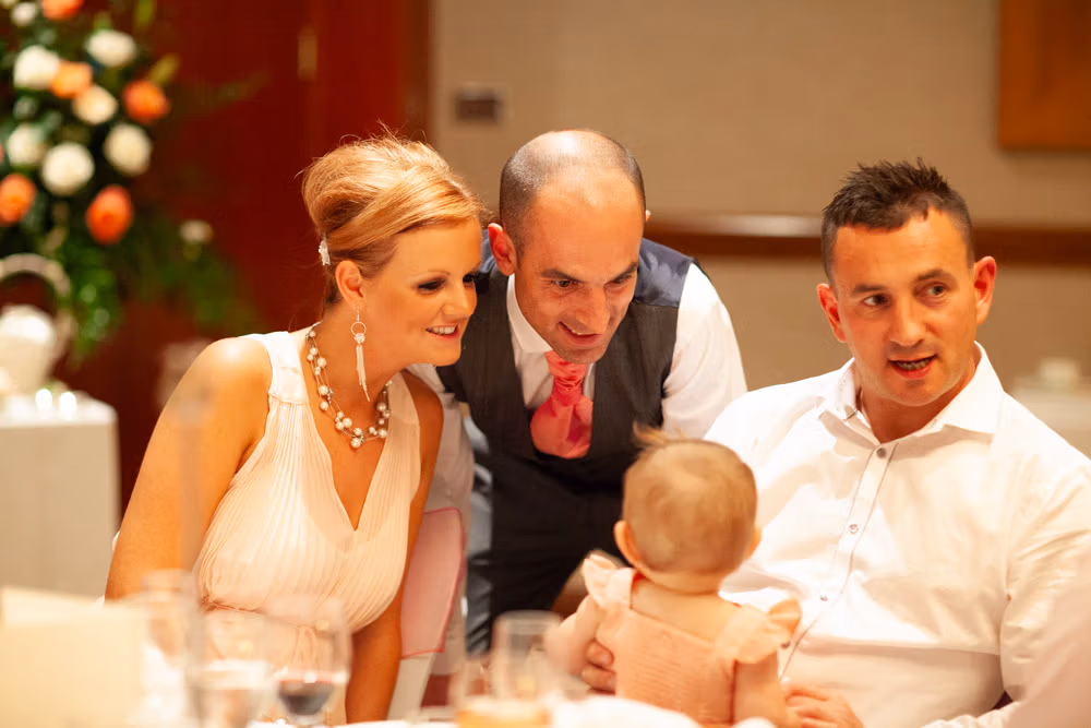 The wedding breakfast began with thoughtful little details — table settings, cake decorations, and a sweet moment as their daughter carefully buckled her shoes. Guests chatted warmly while the room filled with laughter and energy.