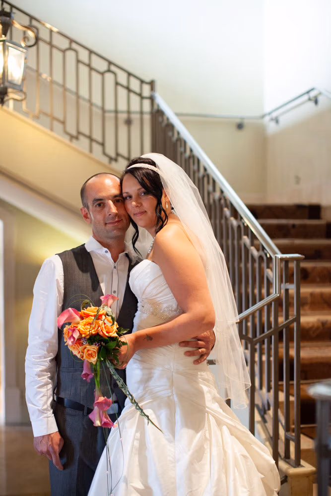 Before the evening truly began, we stepped aside for a handful of portraits. At the foot of the grand staircase, framed by the tall doorway, and finally outside in the welcome return of the sun — each shot felt full of ease and connection.