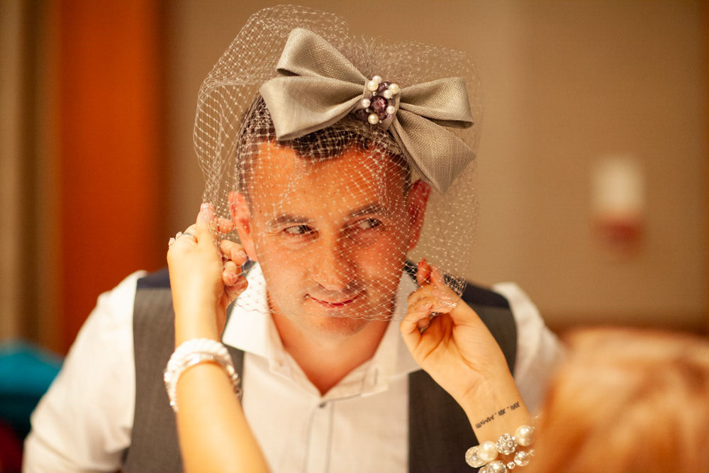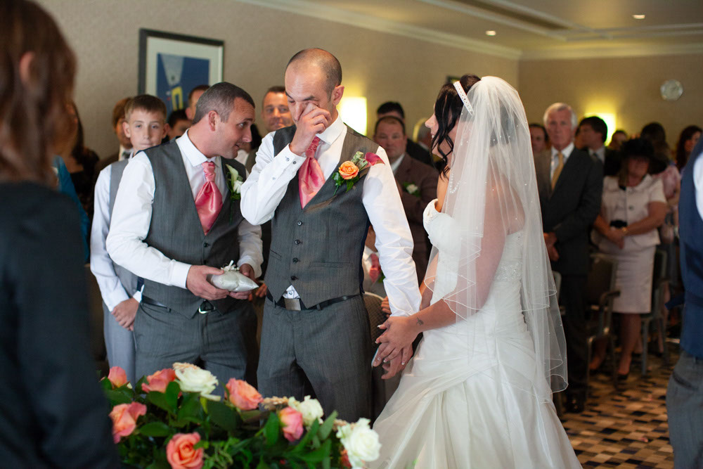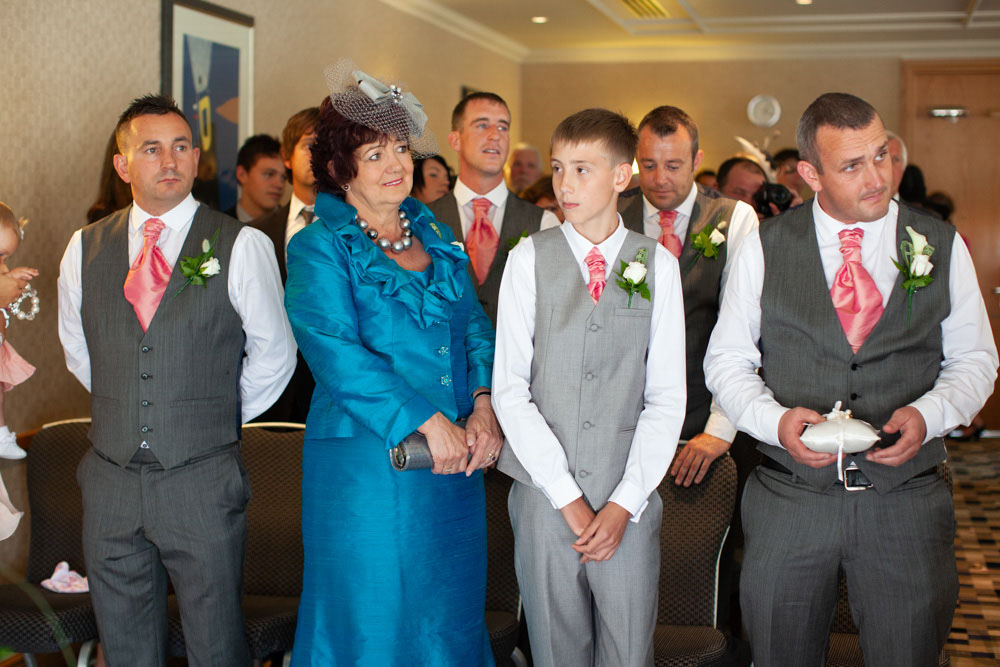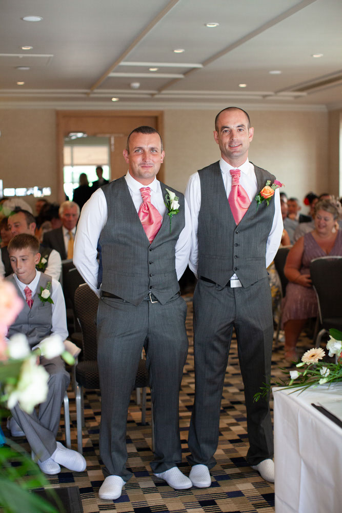 The ceremony room was filled with anticipation and quiet excitement. The groomsmen, dressed in sharp grey suits and bright white shoes, shared easy laughs that helped break the tension. Standing alongside his best man, Dave tried to keep calm, but his eyes said it all.