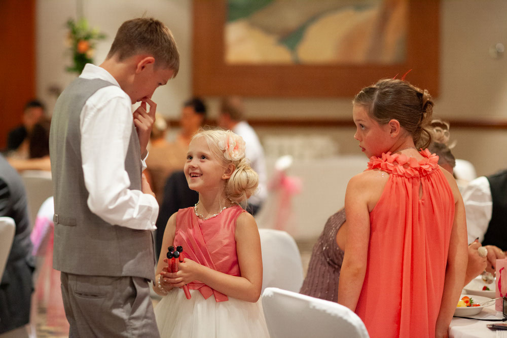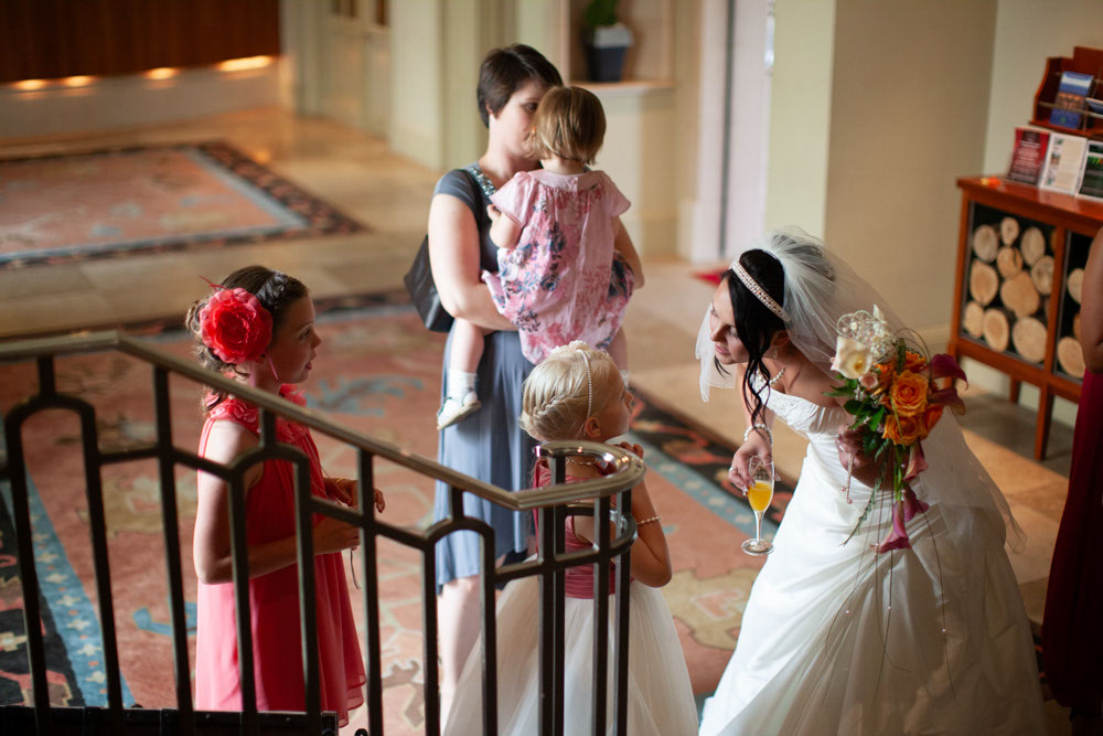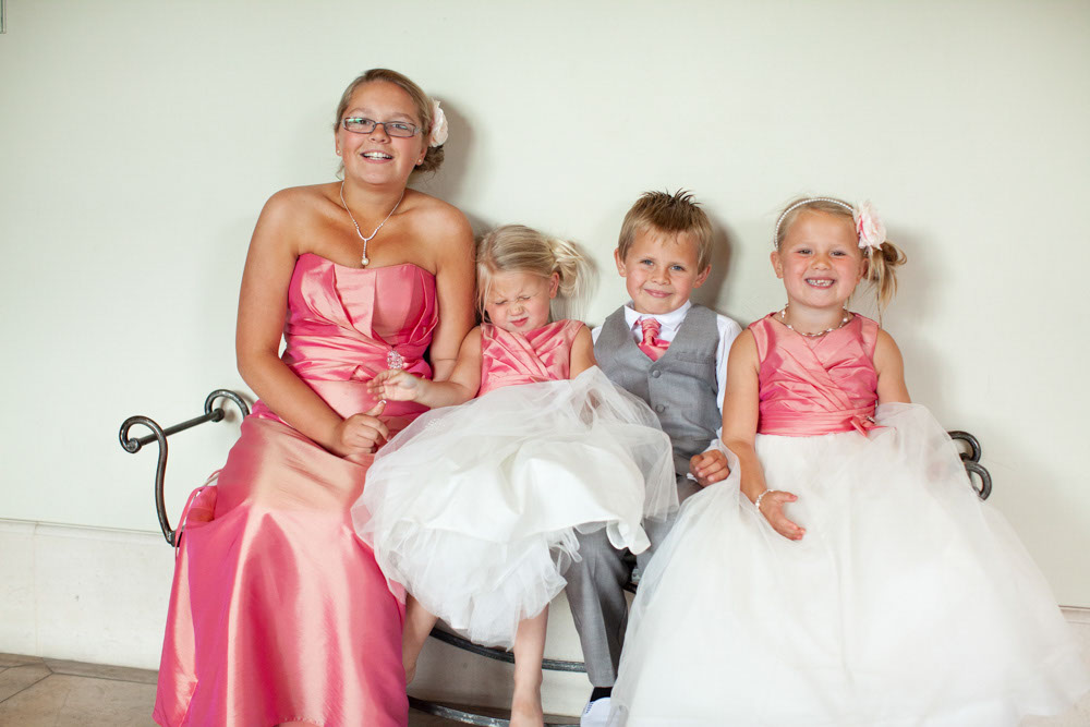 The little bridesmaids lit up the bright hallway, sitting together on the padded seat and giggling their way through a few fun photos. Soon after, Gemma & Dave gathered around the cake, smiling, cutting, and sharing a kiss as everyone cheered.