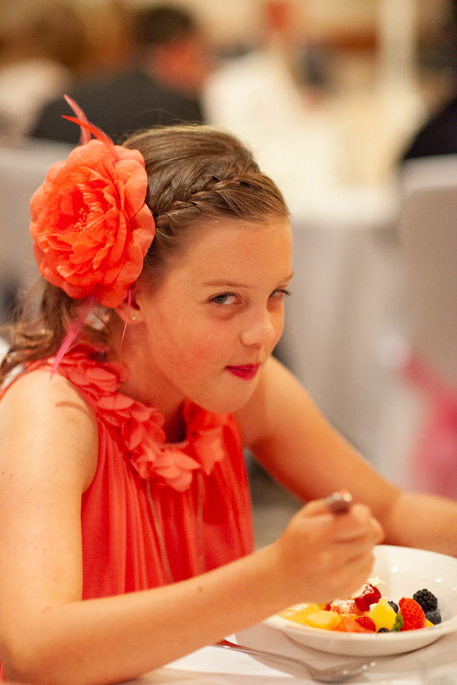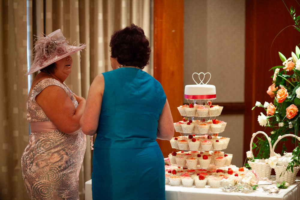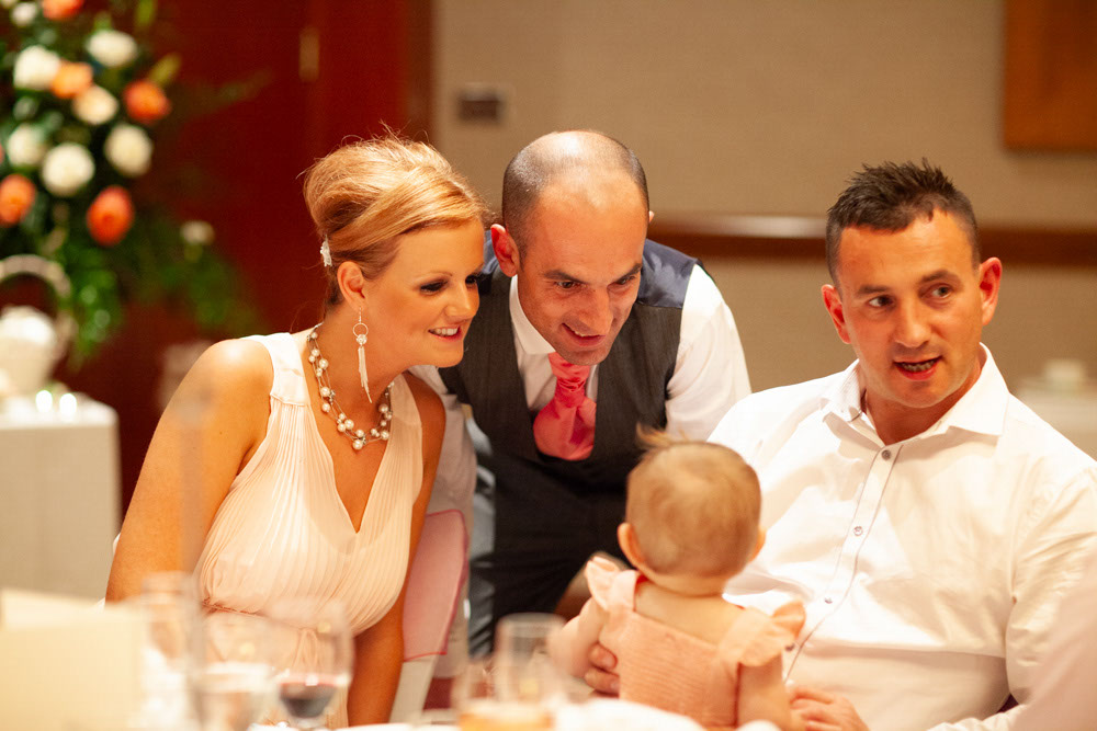The wedding breakfast began with thoughtful little details — table settings, cake decorations, and a sweet moment as their daughter carefully buckled her shoes. Guests chatted warmly while the room filled with laughter and energy.