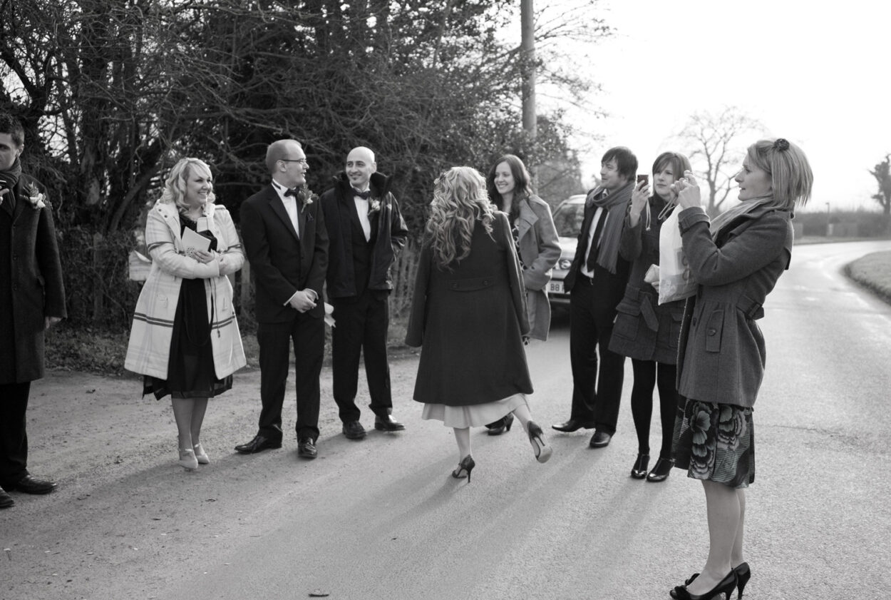 Guests greet the couple outside, wrapped against the cold.