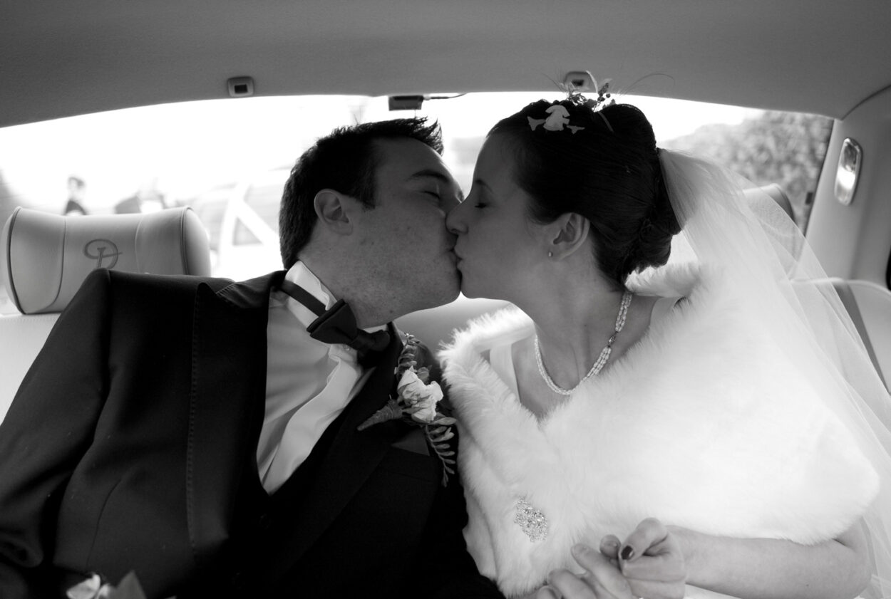 Outside, Emelie arrived with her grandad and sister in a polished black car. Veil adjusted, bouquet passed, and a small laugh shared with the driver. These are the moments that feel like film scenes — tiny, real, unforgettable.