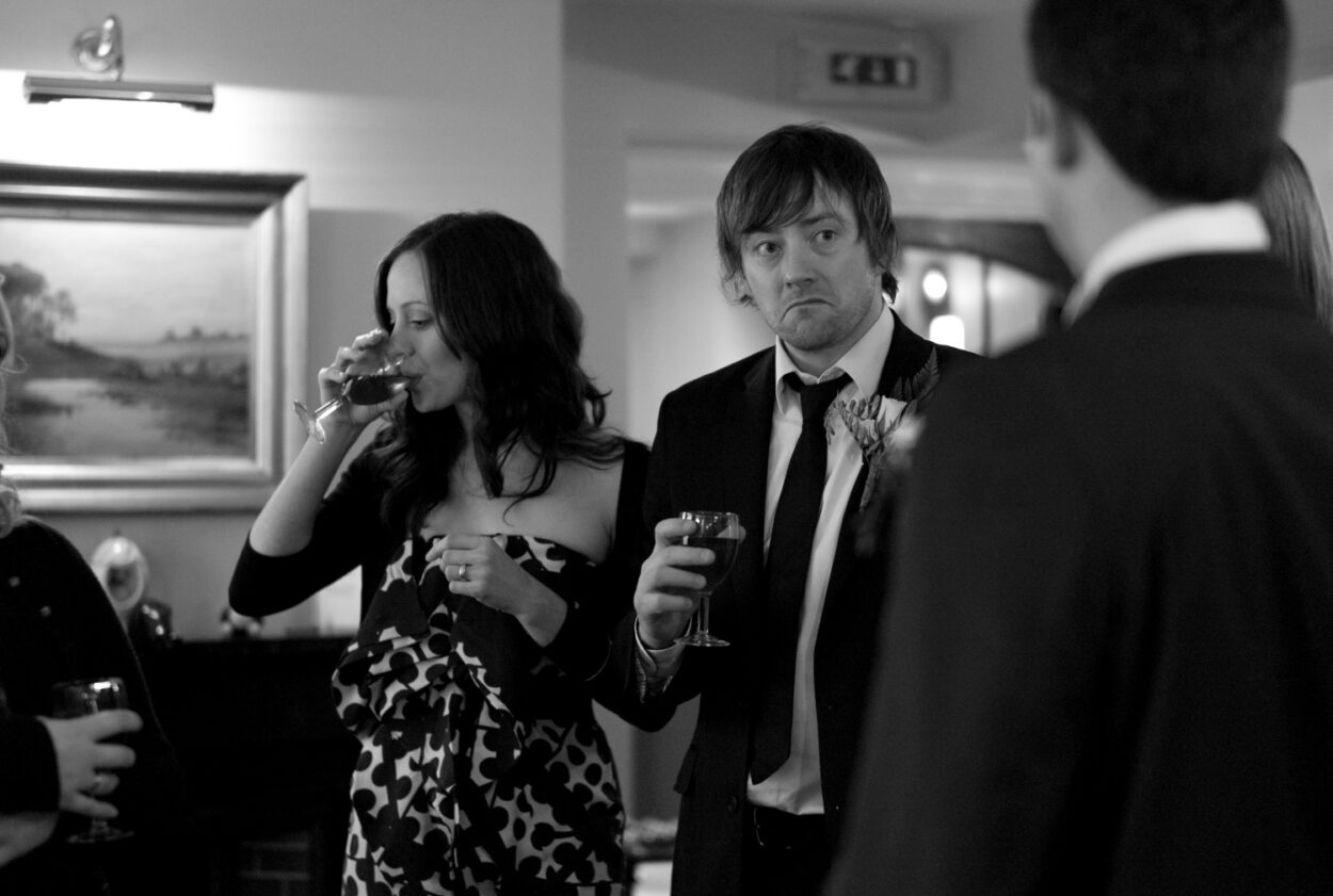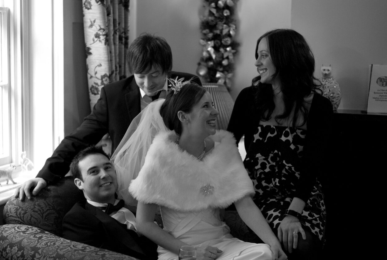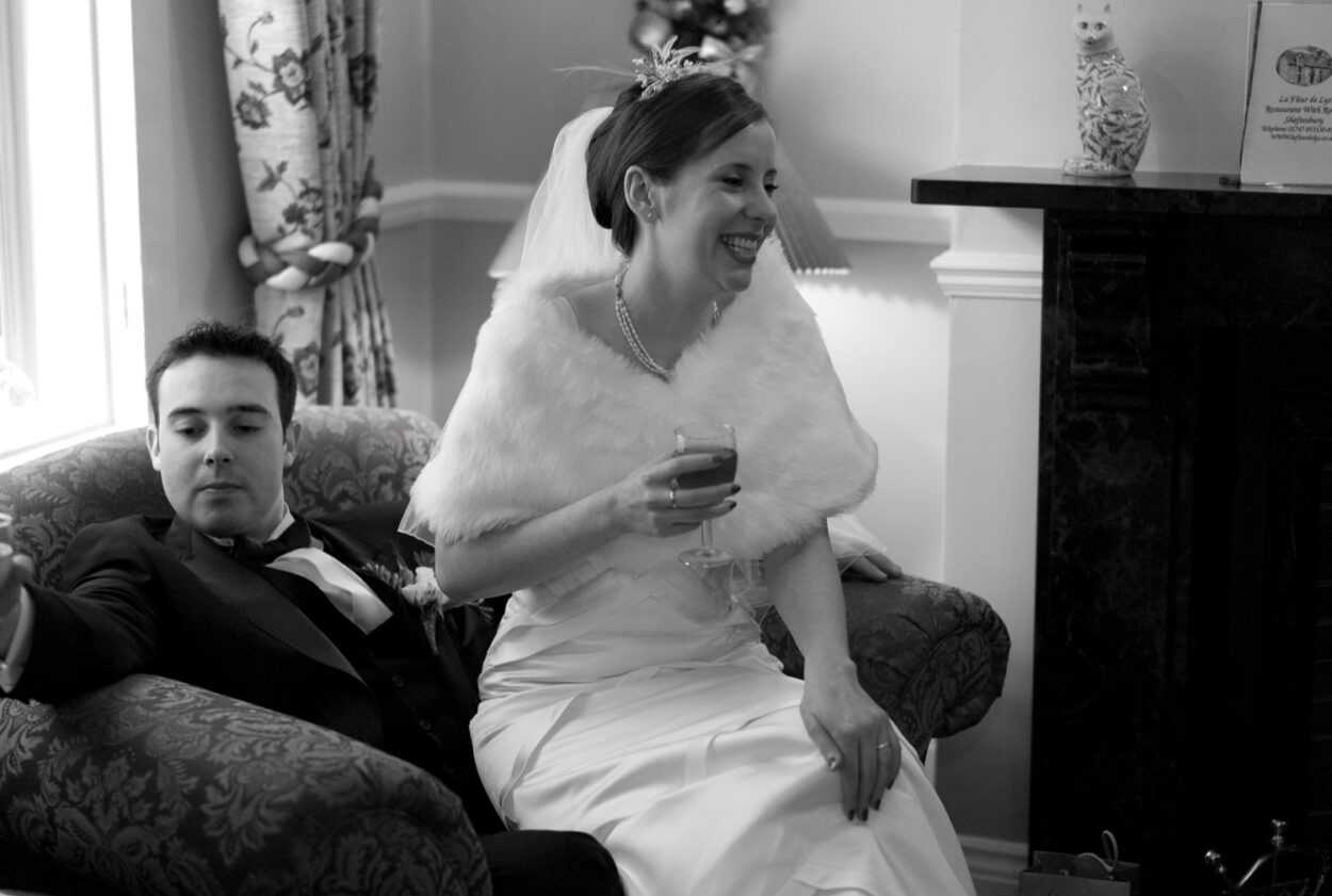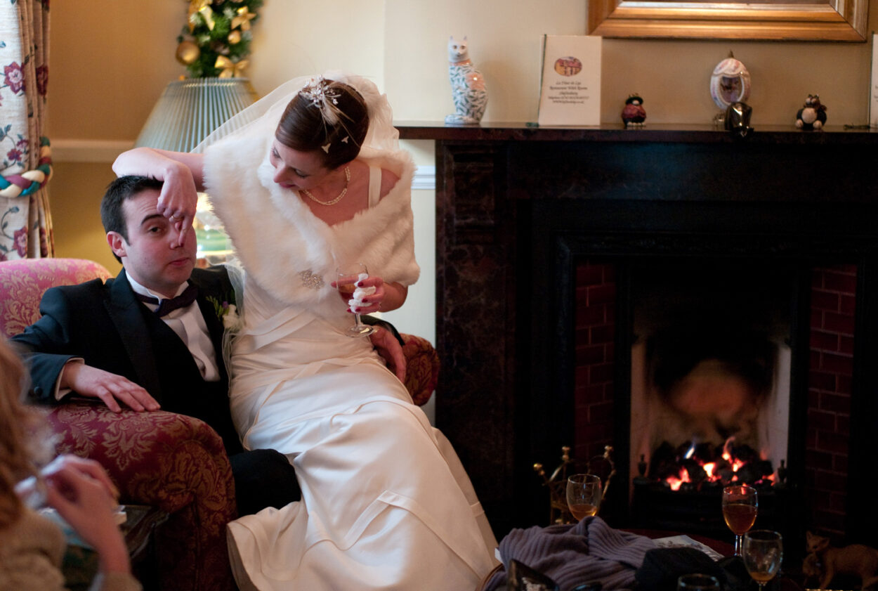 Back in Shaftesbury, the fire-lit rooms filled quickly with chatter and clinking glasses. Group photos flowed naturally — simple, warm, and full of personality. My favourite moment: the bride perched on Matt’s knee, gently tapping his nose with a smile that said everything.