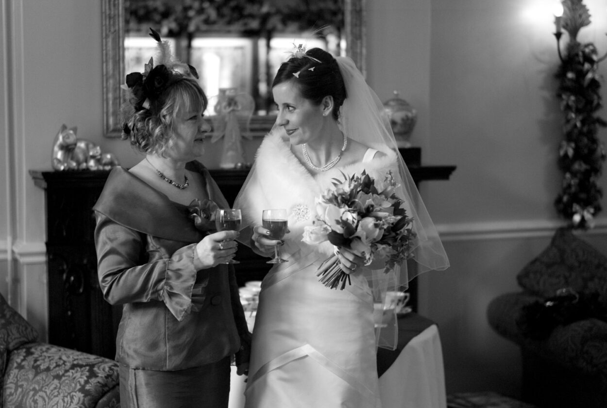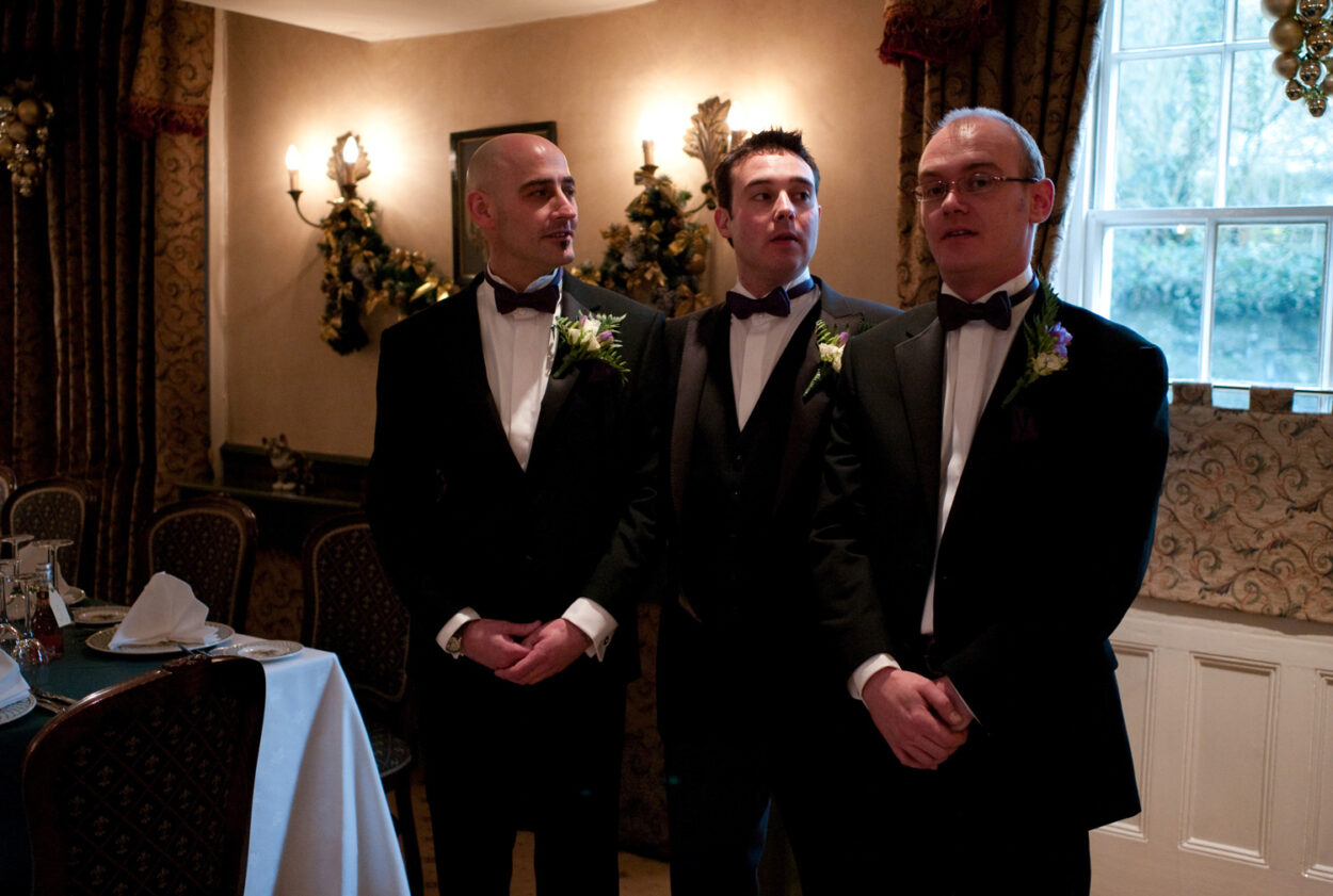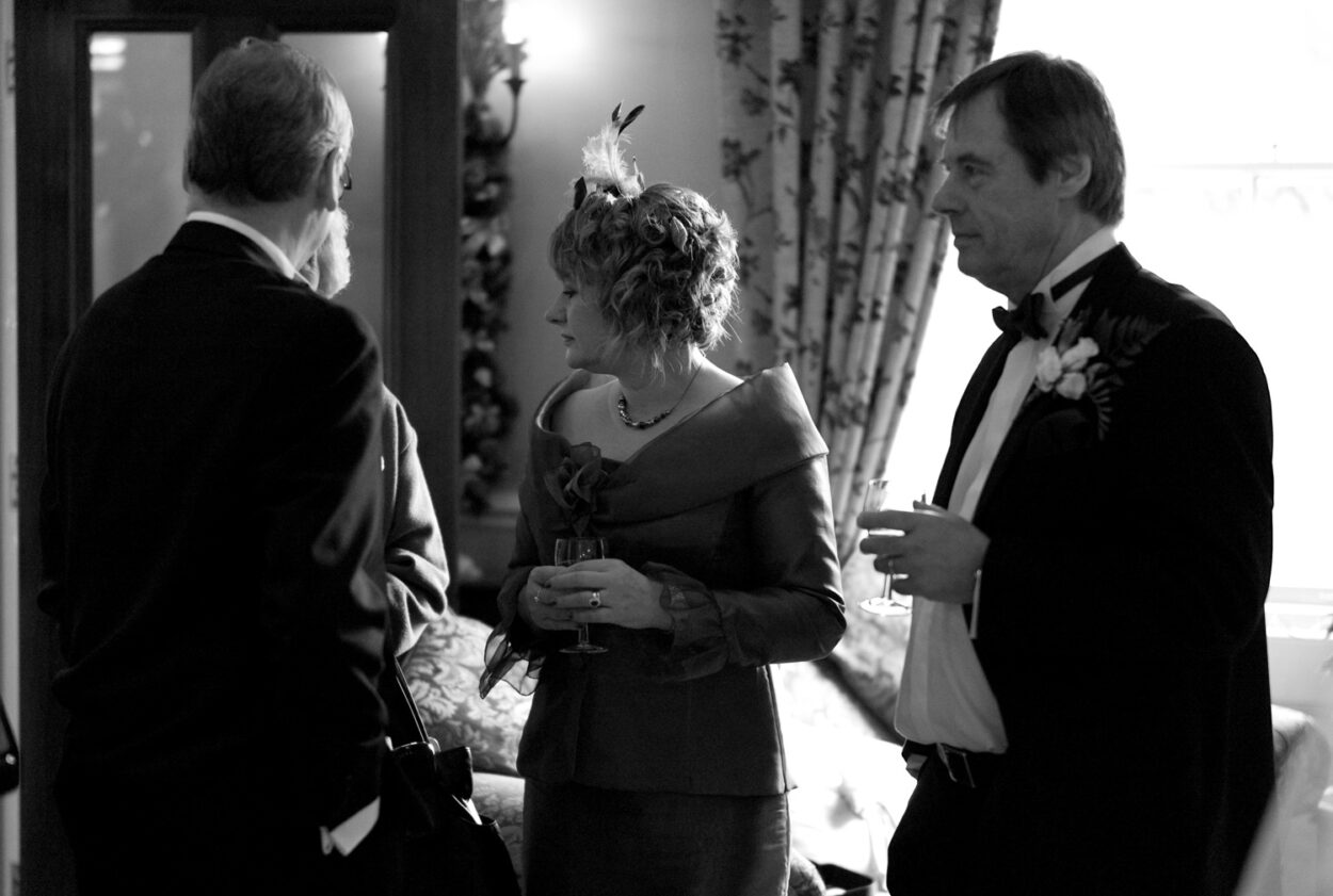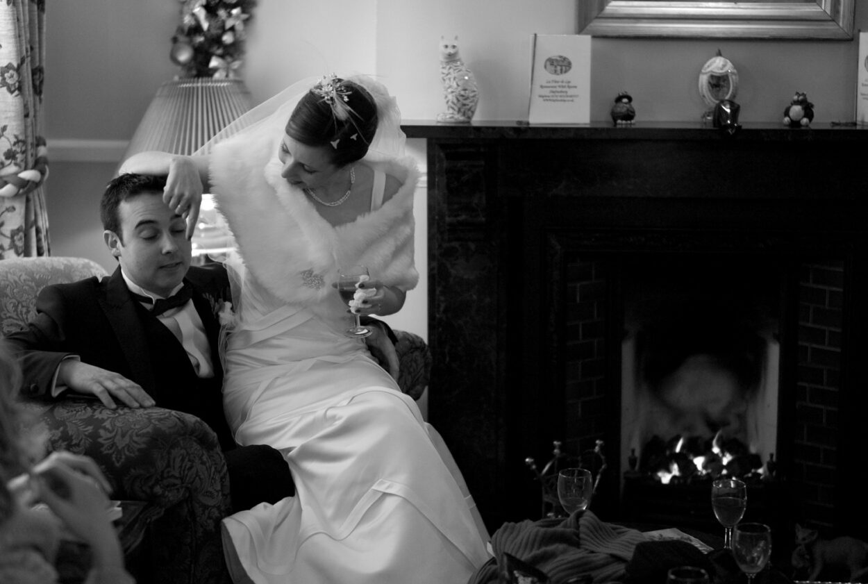 Back at the Fleur de Lys, the story deepened: satin dress, veil moments, shoes fastened on the carpeted floor, quick checks in the mirror, and that final breath before leaving. Winter sunlight spilled through the windows — a perfect contrast to the warmth inside.