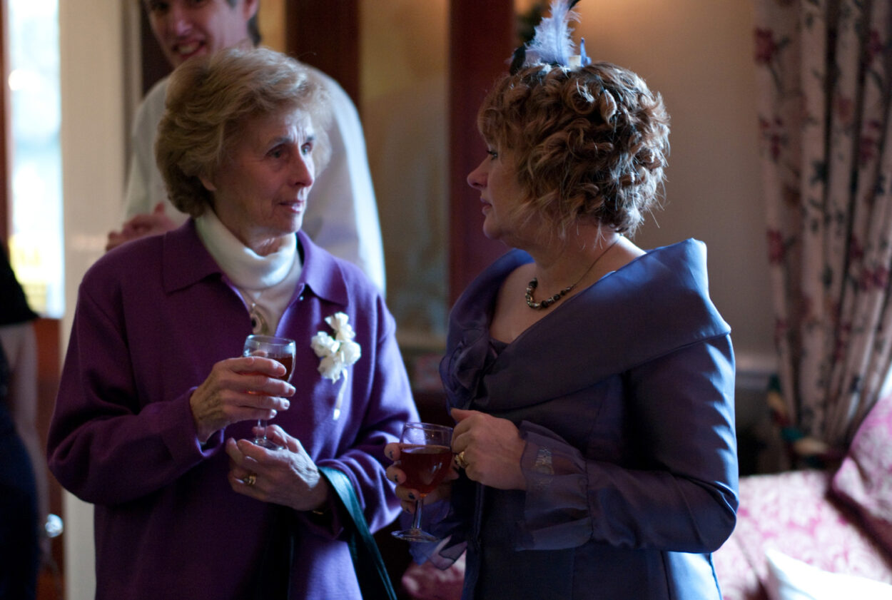 Guests enjoyed cake, wine, and laughter while the couple relaxed into the second half of their day.