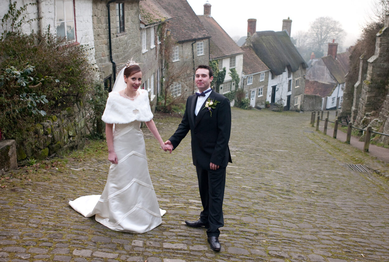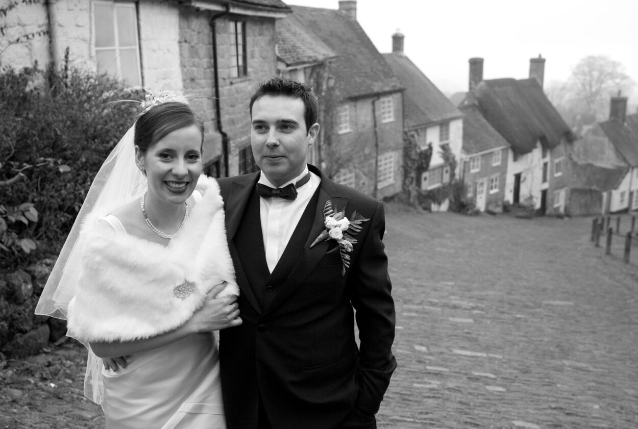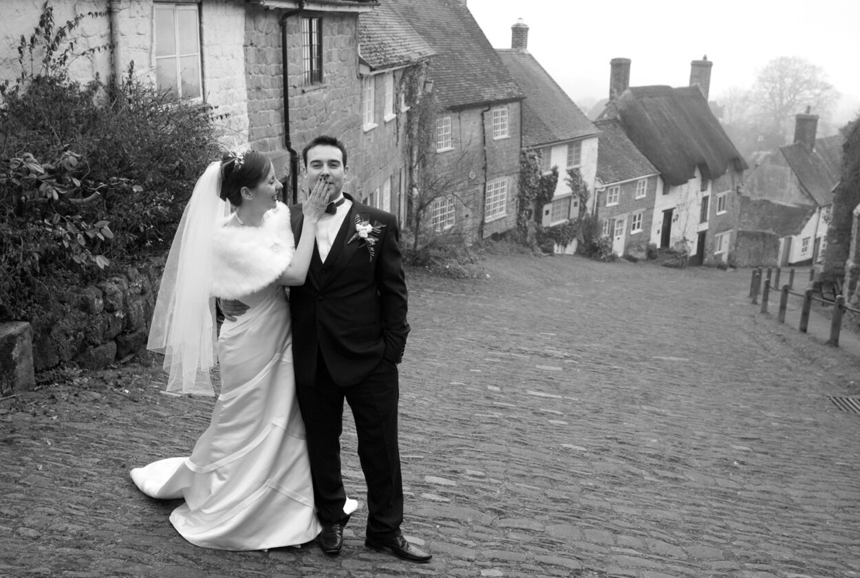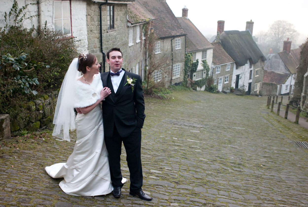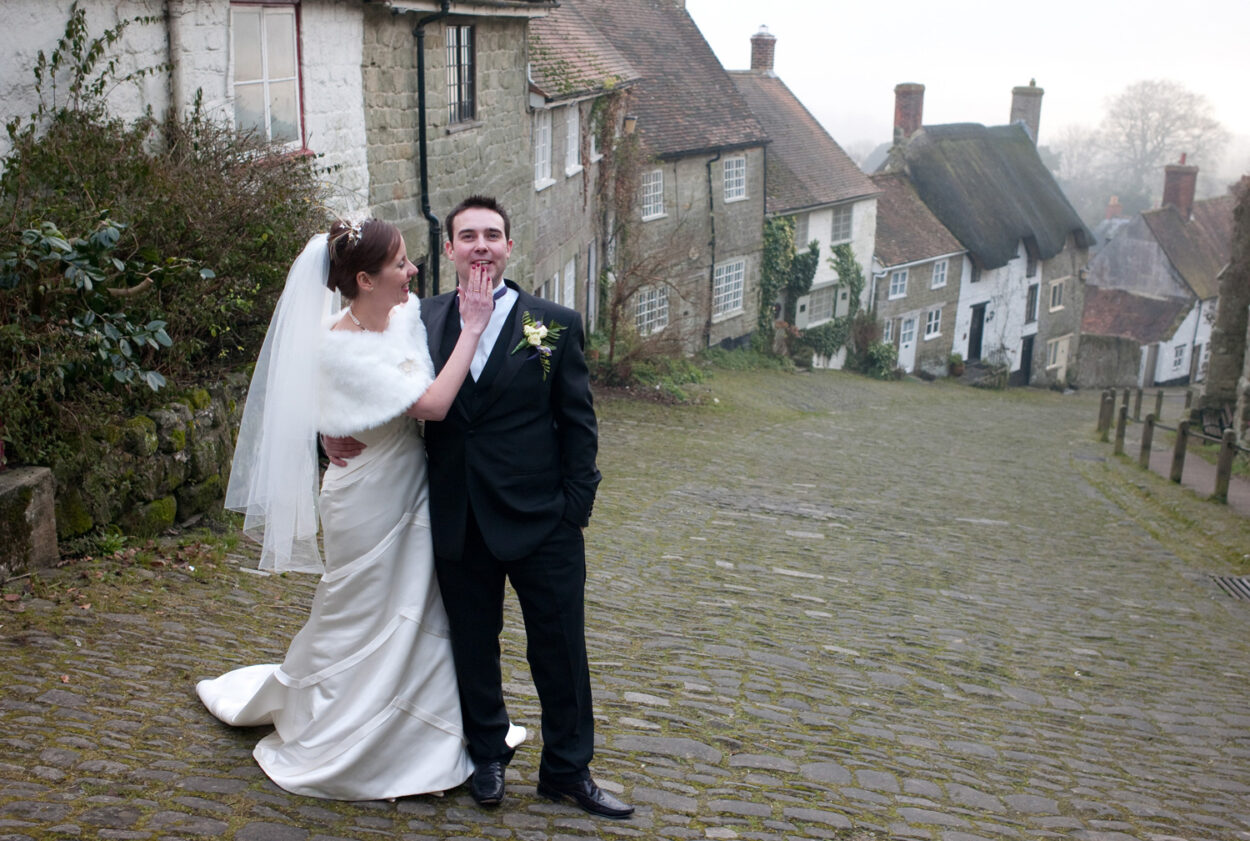 Gold Hill — famous from the Hovis advert — gave us a cinematic backdrop for a short walk and a handful of portraits. Cold air, cobbled streets, warm arms around each other. A perfect pause in the day.