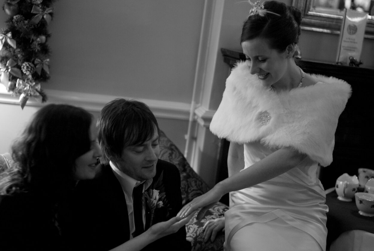 Back inside, we grabbed a final set of small family groups before ending with a lovely moment: Emelie showing her wedding ring to friends who beamed with her.