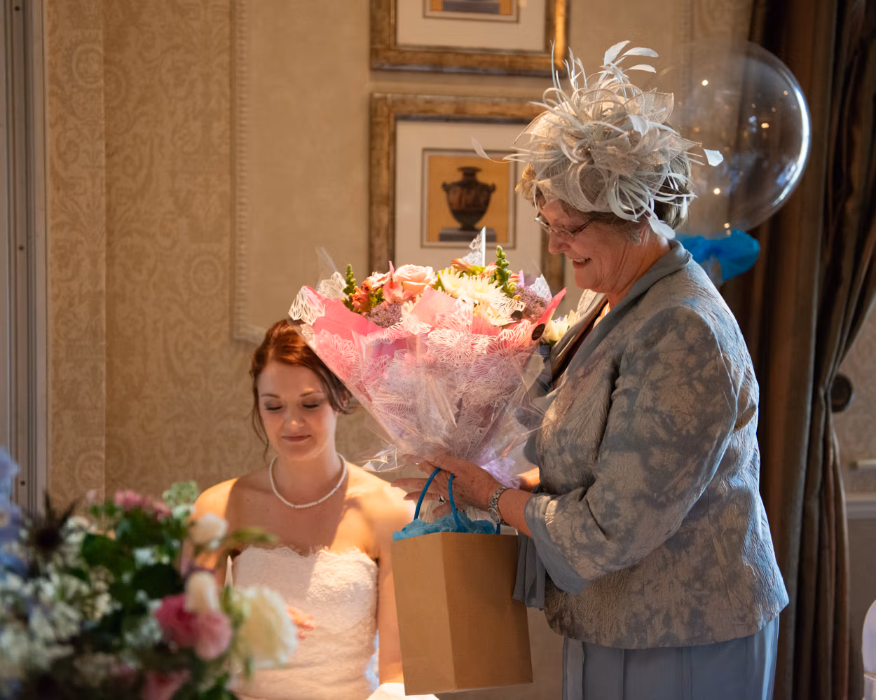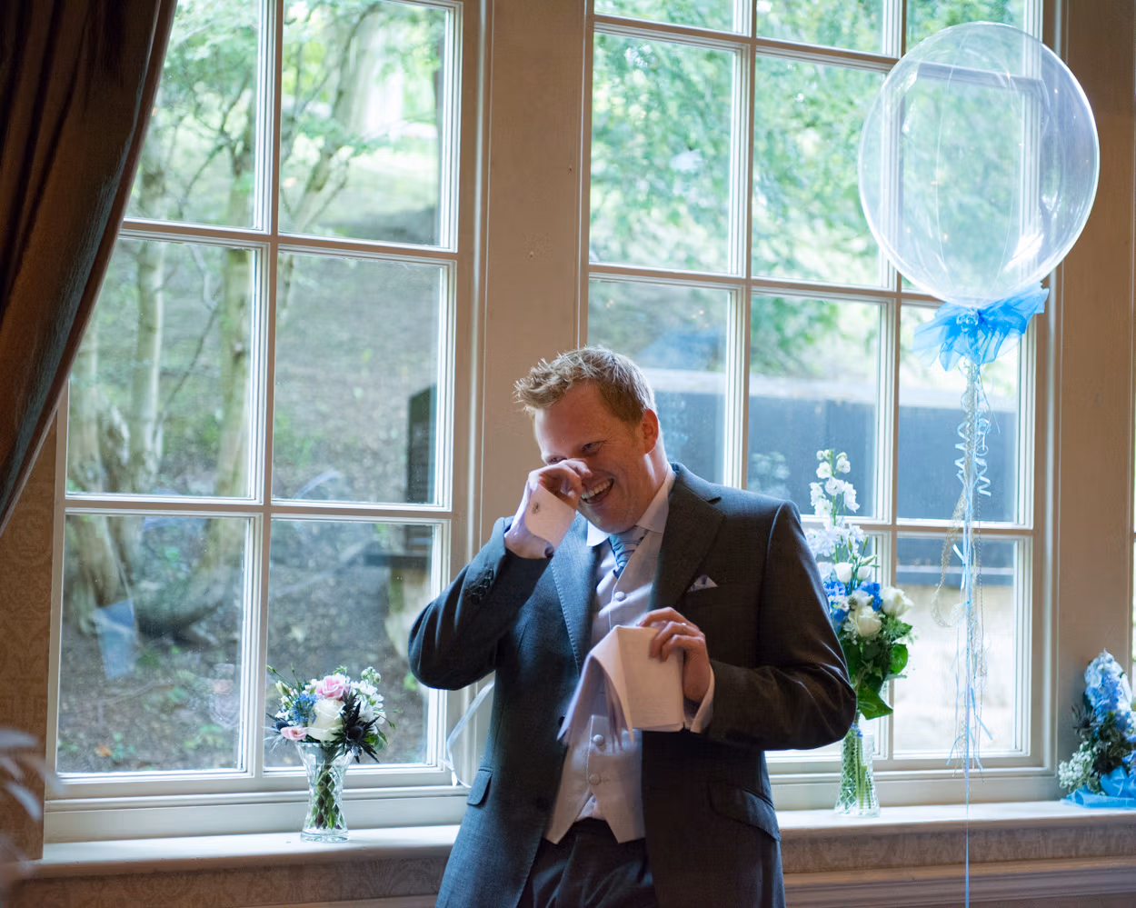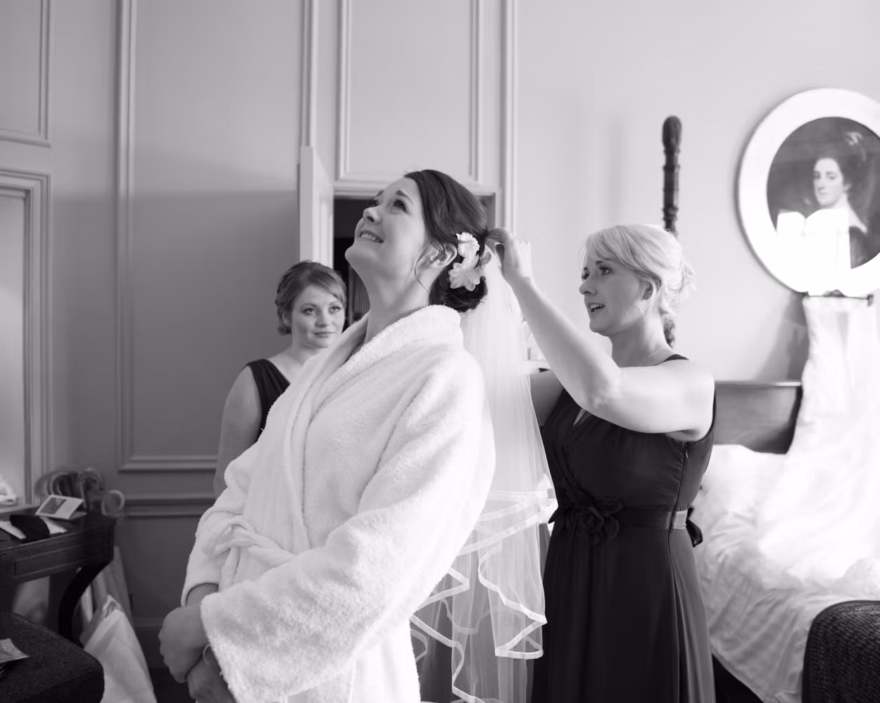 I arrived as Tanya was having her make-up done, the room calm and quietly expectant. A blue and white bouquet rested nearby, and her dress hung gently against a painting above the four-poster bed — everything waiting for the journey to Kirk Deighton.
