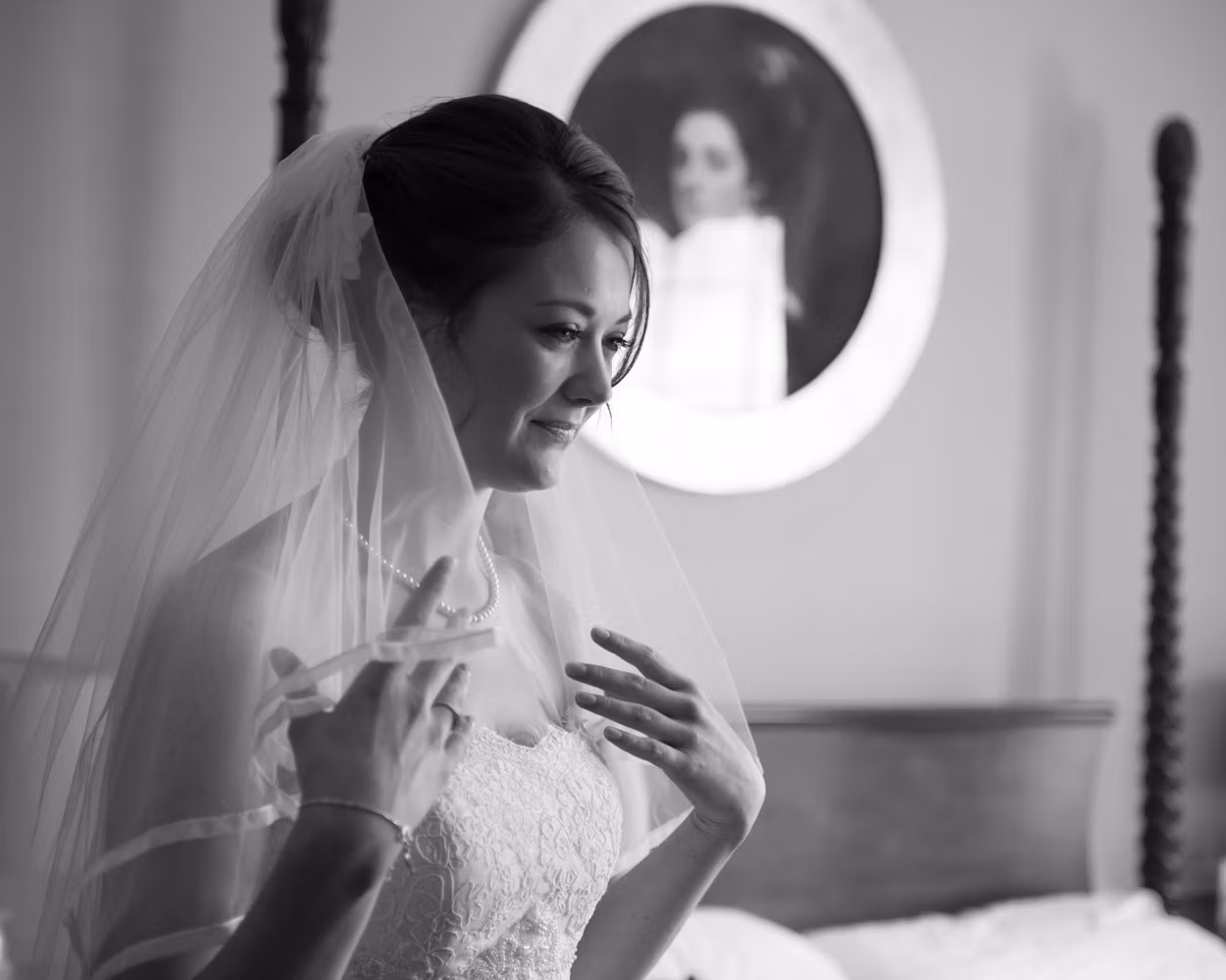 Her dress hung from a picture frame beside the four-poster bed, the veil catching the light as it moved slightly in the air. A blue and white bouquet rested nearby, waiting for the next part of the day to begin.