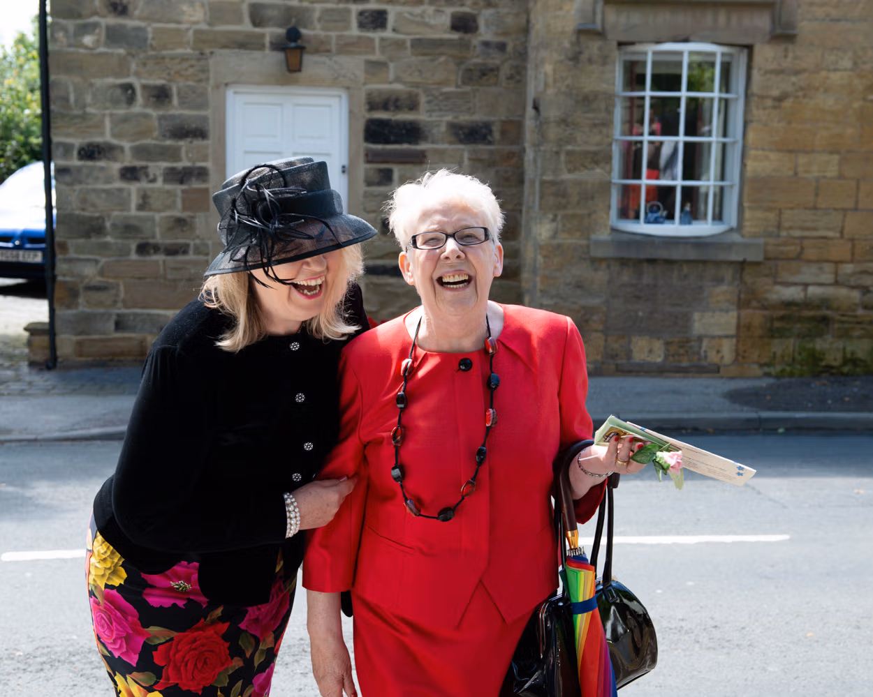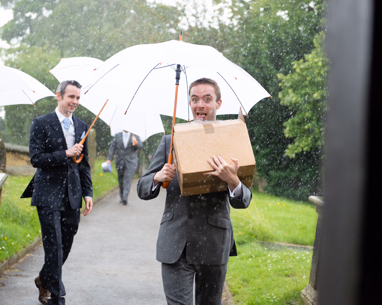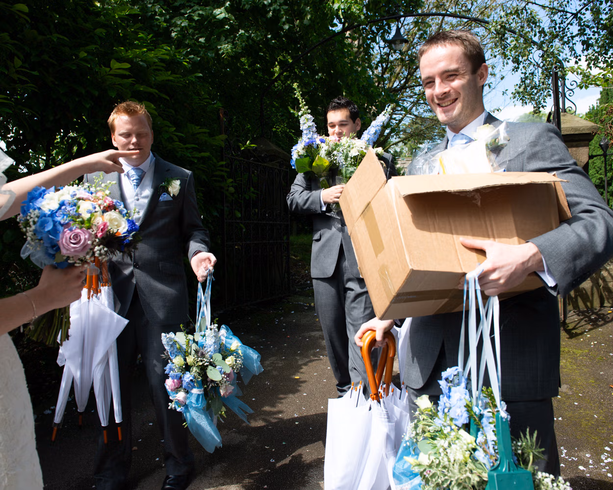 The morning moved between rain and sunshine as guests gathered at Kirk Deighton, some sheltering quietly beneath umbrellas, others arriving through the shifting light along the pathway.