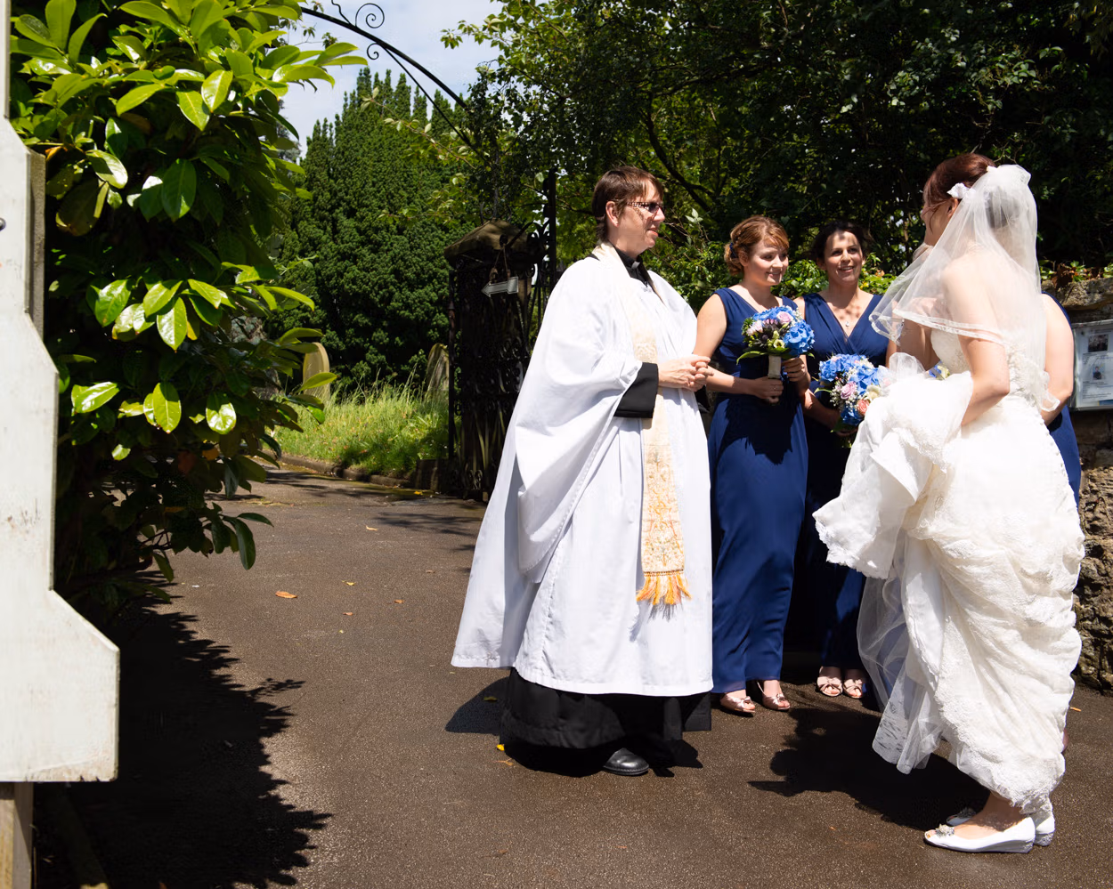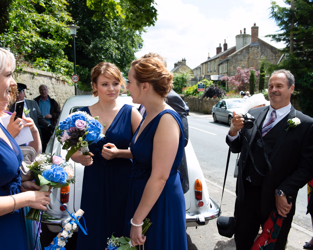 Then, just as the clouds began to lift, a vintage white Rolls pulled up. Tanya stepped out smiling, joining her bridesmaids as they walked together towards the church, the light softening around them.