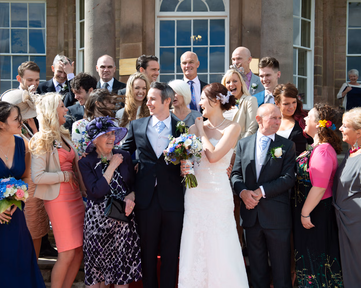 By the time we arrived, the light had shifted again. Sunshine returned as they stepped out beside the vintage Rolls, the hall behind them, guests beginning to gather on the steps. Laughter carried through a handful of portraits before everyone moved inside, the day settling gently into the next part of the celebration.