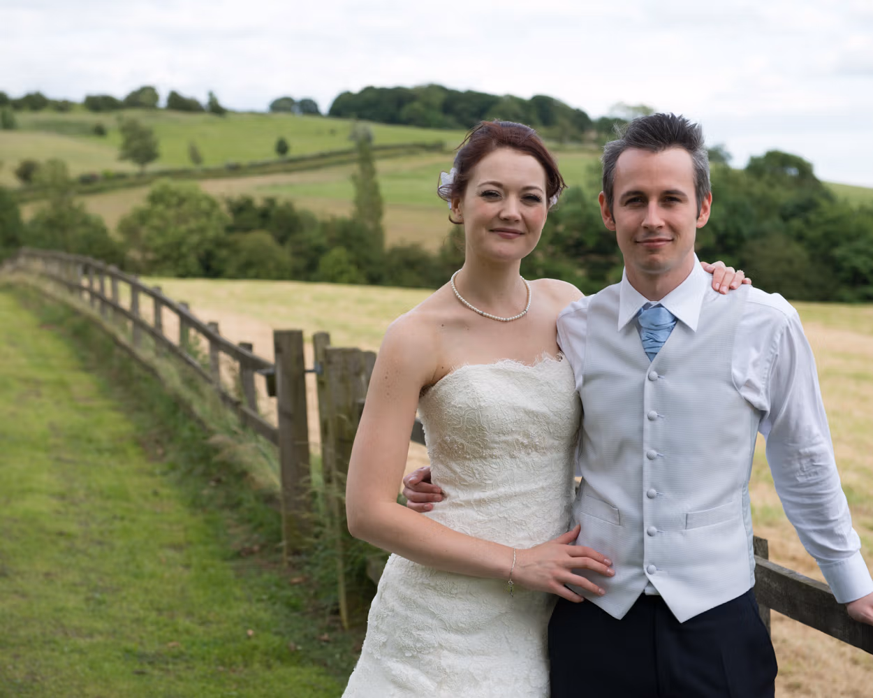 Their ceremony took place in an 11th-century church — emotive, sincere, and deeply felt. Afterwards, we drove back towards Wood Hall, pausing briefly along the way, the hall appearing softly in the distance as we stepped into the long grass for a few quiet portraits.