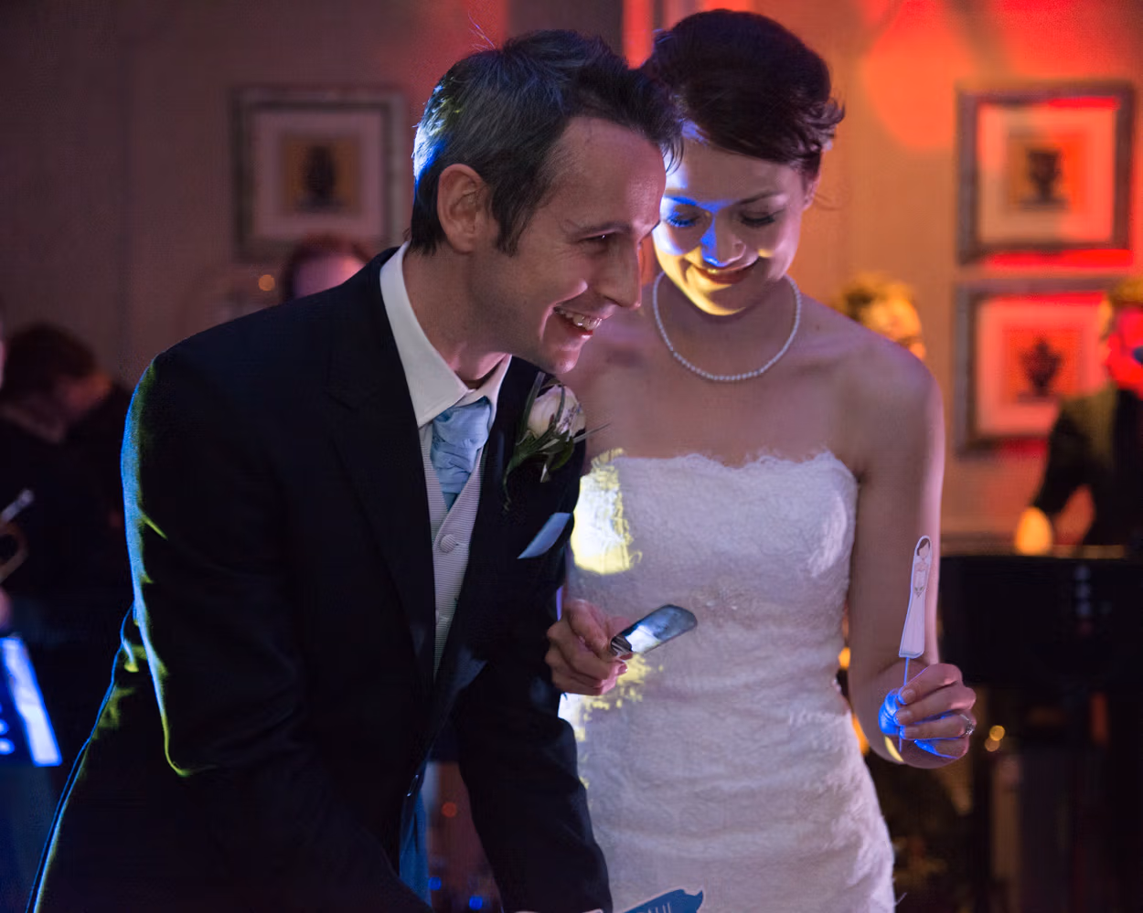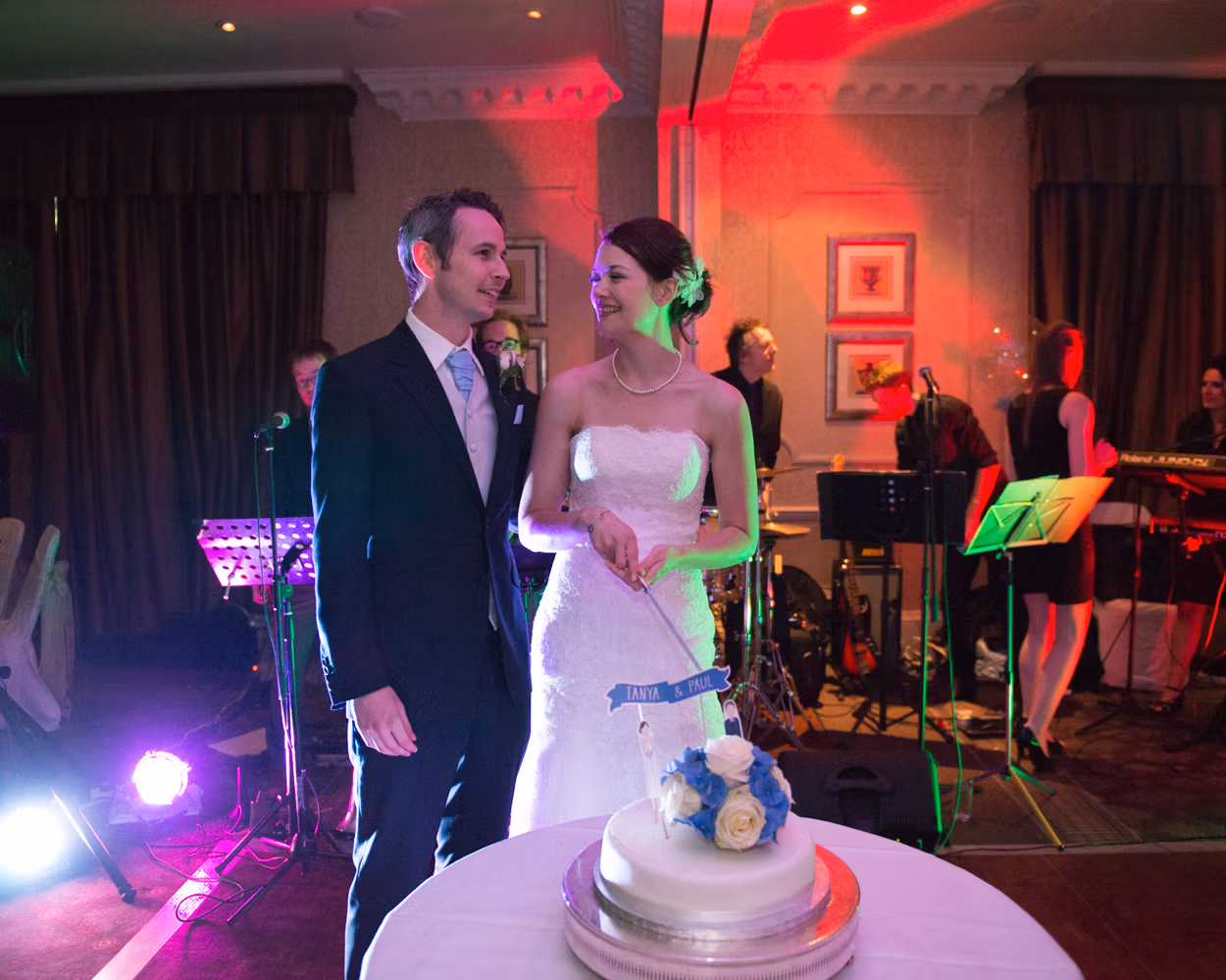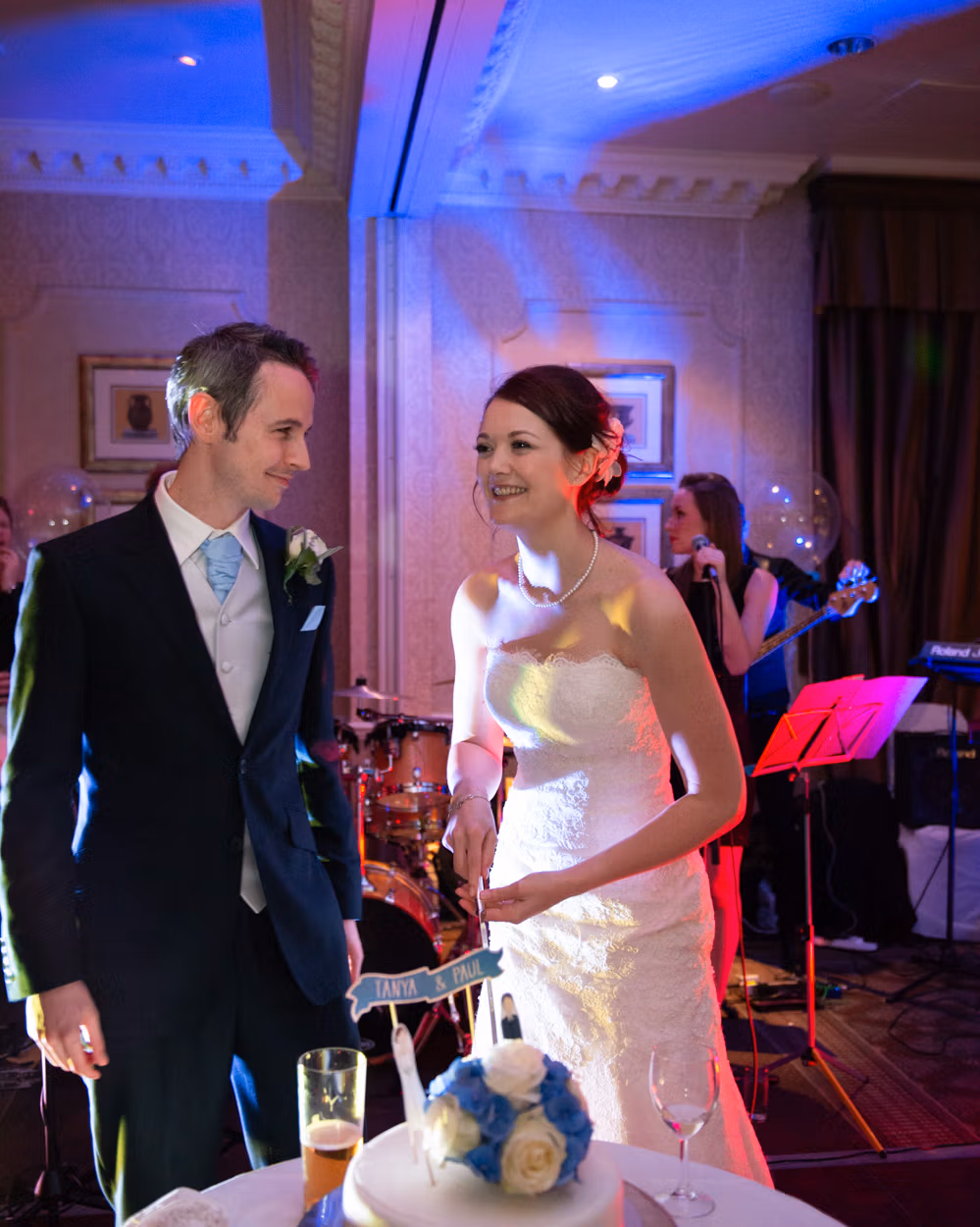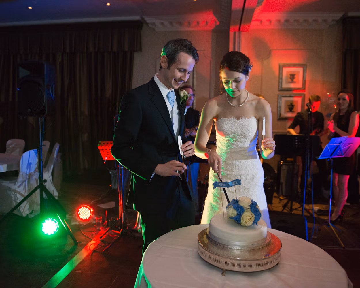 Back inside, evening settled gently through the rooms. The cake was cut without fuss, a small moment shared between them before the music began. Nearby, the soft glow of the jazz band carried through the space as guests gathered once more.