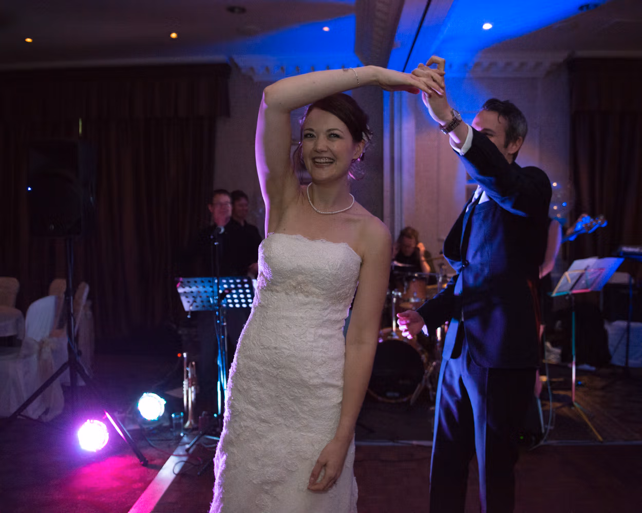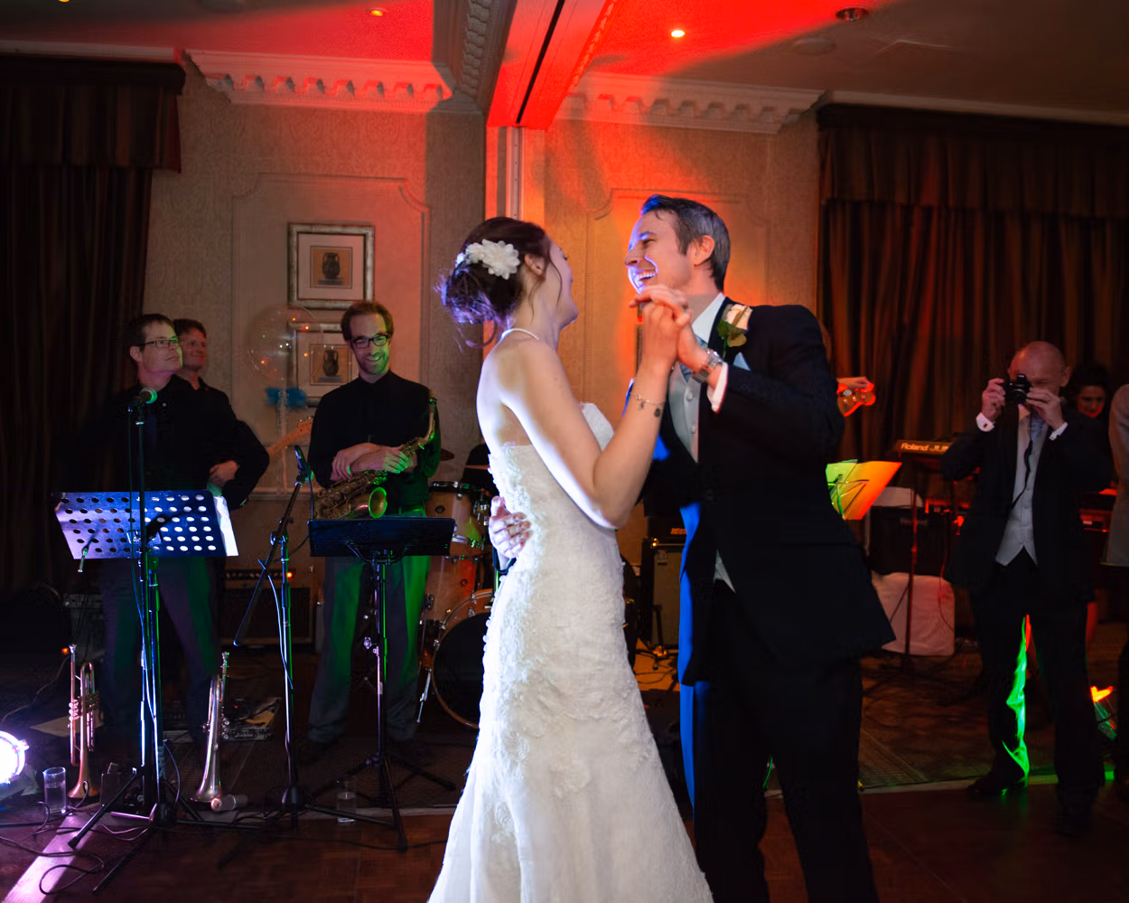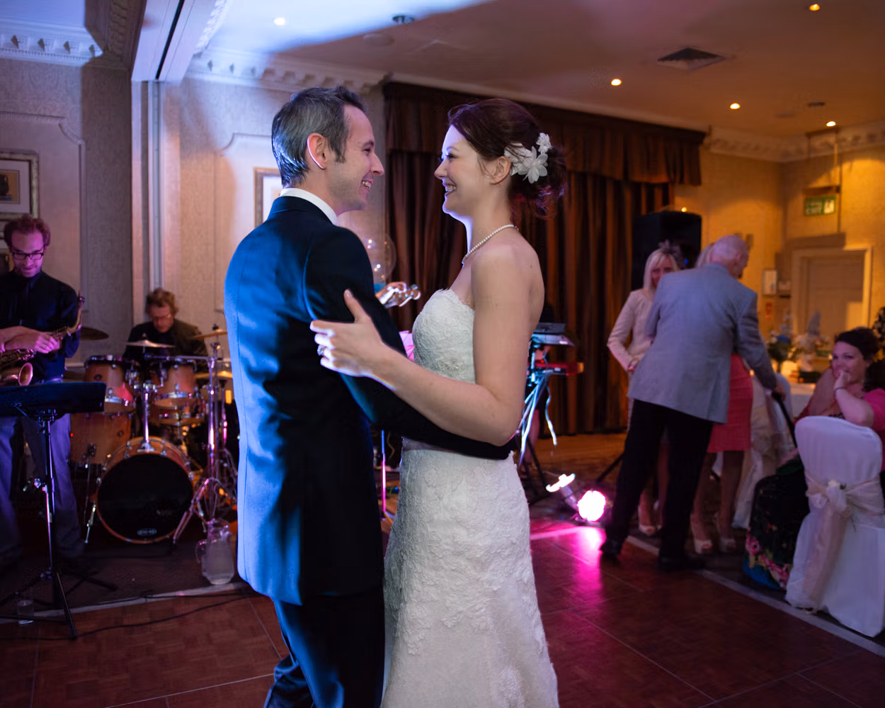 The wedding breakfast and speeches carried warmth into the early evening, followed by a first dance and the gentle rhythm of a jazz band that slowly lifted everything into motion.